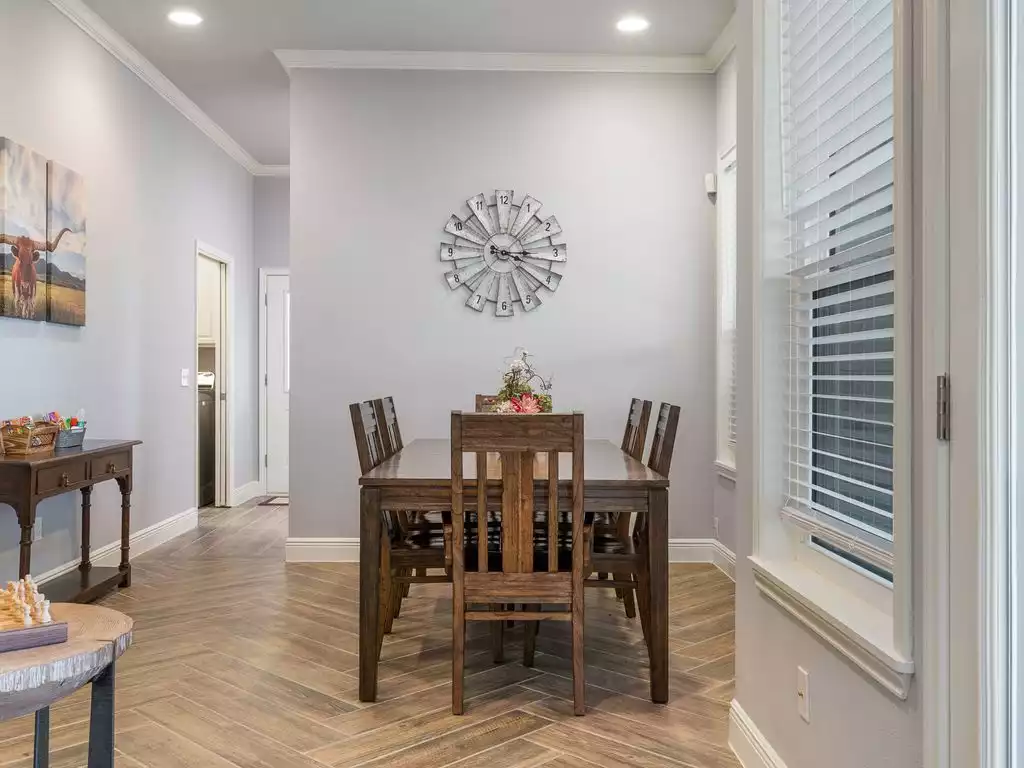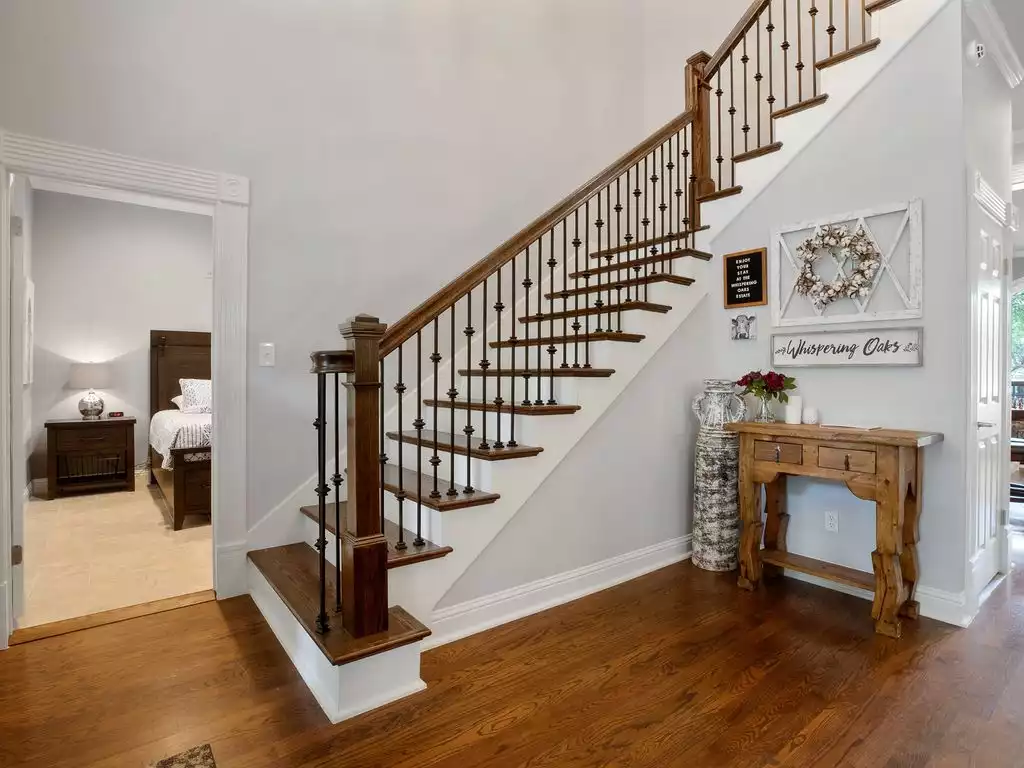 Bright with natural sunlight, the private master suite is a quiet escape from the main living area. The warm bed chamber is crowned by a deep tray ceiling and has private access to the covered patio, deck and pool. The spa-quality master bath touts custom flooring, quartz tops, dual vanities, a jet tub, frame less glass shower and an enormous walk-in closet with built-in drawer stacks. The main floor also holds a second guest bedroom. A secondary staircase located by the kitchen leads up to another bedroom and a bonus room that has 2 Queen beds with a separate bedroom off of it. The remaining upstairs four bedrooms of the main house, as well as another bonus room with a work station, are accessed by way of the main staircase in the foyer.