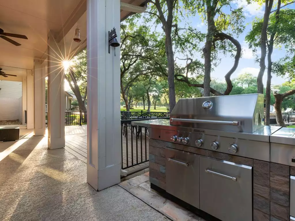 The home’s sprawling park-like grounds are punctuated with hardwood, elm and native oak trees. Water-efficient plants and child-safe wrought-iron fencing surround a pool with a hot tub and a poolside cabana with twin wide-screen TV’s. Wood-burning fire pit with seating for 10.