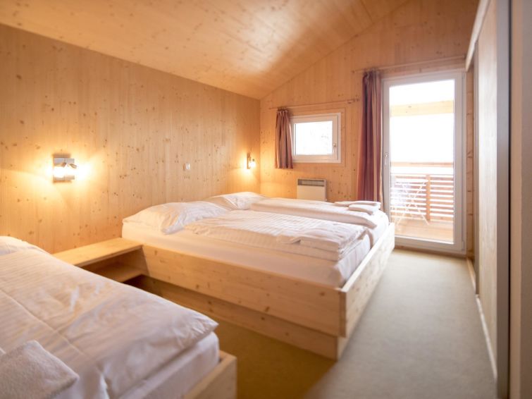 Turracher Höhe: Very comfortable holiday village "Alpenpark Turrach by Alps Resorts", 1'800 m a.s.l.. 49 houses in the resort. 2 km from the centre, 2 km from the lake, 2 km from the skiing area, in the woods. In the complex: reception, WiFi, storage room for skis, central heating system. In Winter: please take snow chains. Parking (for 2 cars, limited number of spaces, in winter). Central parking spaces. Supermarket 10 km, restaurant 2 km, café 2 km, lake Turracher See 2 km. Walking paths from the house 10 m, skisport facilities 2 km, ski rental 2 km, ski school 1 km, children's ski school 2 km, cross country ski track 2 km. Nearby attractions: Edelsteingallerie Kranzelbinder, Montanmuseum Turrach 7 km, Nockalm Panoramastraße 7 km. Hiking paths: 3 Seen Wanderweg. Free ski bus service to the ski region Turracherhöhe. All houses/apartments are individually designed/furnished. The holiday properties may differ in situation, size and location. The distance to the ski lifts and the town center can be 1 - 2 km depending on the location of the houses. ATTENTION: Piste butler (“Pistenbutler” winter program) and “Almbutler” program from mid-June to mid-October also included! The reception building (ski room, reception) is outside the holiday village!" 10 mit Sauna und Sprudelbad Innen", 7-room chalet 160 m2. Spacious, luxurious and wooden furniture furnishings: living/dining room with dining nook and satellite TV (flat screen). 1 double bedroom. Open kitchen (oven, dishwasher, 4 ceramic glass hob hotplates, toaster, kettle, microwave, electric coffee machine). Shower/WC. Upper floor: 1 room with 2 beds. 1 room with 1 bed and 1 double bed. 1 room with 3 beds and 1 x 2 bunk beds. 1 room with 1 x 2 bunk beds. Living/sleeping room with 1 x 2 bunk beds. Bath/WC, shower/WC, hydro massage bath, Sauna. Balcony, terrace. Terrace furniture. Beautiful view of the mountains. Facilities: Internet (WiFi, free). Please note: non-smokers only. The sauna in the wellness pool is an infrared sauna.