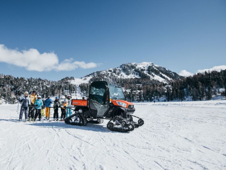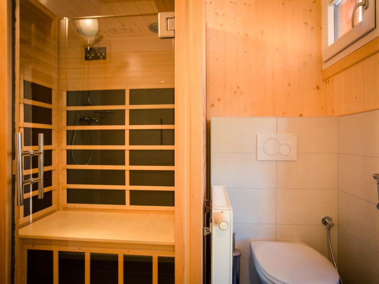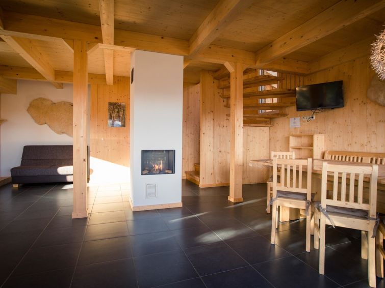 Turracher Höhe: Very comfortable holiday village "Alpenpark Turrach by Alps Resorts", 1'800 m a.s.l.. 49 houses in the resort. 2 km from the centre, 2 km from the lake, 2 km from the skiing area, in the woods. In the complex: reception, WiFi, storage room for skis, central heating system. In Winter: please take snow chains. Parking (for 2 cars, limited number of spaces, in winter). Central parking spaces. Supermarket 10 km, restaurant 2 km, café 2 km, lake Turracher See 2 km. Walking paths from the house 10 m, skisport facilities 2 km, ski rental 2 km, ski school 1 km, children's ski school 2 km, cross country ski track 2 km. Nearby attractions: Edelsteingallerie Kranzelbinder, Montanmuseum Turrach 7 km, Nockalm Panoramastraße 7 km. Hiking paths: 3 Seen Wanderweg. Free ski bus service to the ski region Turracherhöhe. All houses/apartments are individually designed/furnished. The holiday properties may differ in situation, size and location. The distance to the ski lifts and the town center can be 1 - 2 km depending on the location of the houses. ATTENTION: Piste butler (“Pistenbutler” winter program) and “Almbutler” program from mid-June to mid-October also included! The reception building (ski room, reception) is outside the holiday village!"47 mit IR-Sauna& Sprudelbad Innen", 5-room chalet 120 m2 on 2 levels. Luxurious and tasteful furnishings: open living/dining room with dining nook, satellite TV and flat screen. Open kitchen (oven, dishwasher, 4 ceramic glass hob hotplates, microwave, freezer, electric coffee machine). 2 showers/WC. Upper floor: 1 double bedroom. 2 rooms, each room with 1 bed and 1 double bed. 1 room with 2 x 2 bunk beds. Bath/WC, hydro massage bath, Sauna. Balcony terrace. View of the mountains. Facilities: Internet (WiFi, free). Please note: non-smokers only. Smoke alarm. The property is one of a type of property or apartment. The sauna is an infrared sauna. The room layout may vary.