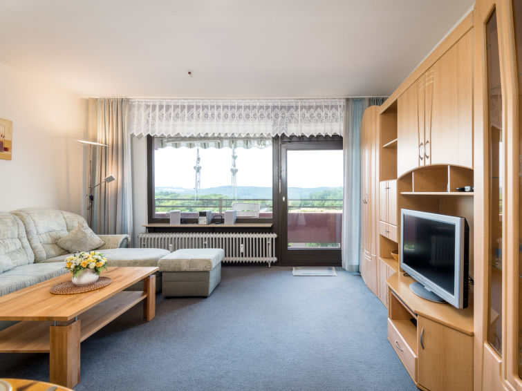 Lahnstein 12 km from Koblenz: Apartment block "Ferienpark Rhein-Lahn". In the district of Lahnstein auf der Höhe 4 km from the centre of Lahnstein, 12 km from the centre of Koblenz, 4 km from the river. For shared use: indoor pool (11 x 6 m, depth 120 cm) with internal staircase. Shower/WC in the pool area. In the complex: reception, WiFi, sauna (extra). Table tennis, lift, central heating system, washing machine, tumble dryer (for shared use, extra). Parking at the house. E-charging station. Grocery 200 m, supermarket 4.5 km, restaurant 800 m, bakery 4.5 km, bicycle rental 4.5 km, 45 minute walk to the centre, bus stop "Kurklinik" 200 m, railway station "Koblenz (HBF)" 12 km, park "Kurpark" 200 m, outdoor swimming pool 1.5 km, indoor swimming pool 5 km, thermal baths "Emser Therme" 10 km. Golf course (18 hole) 16 km, tennis 500 m, minigolf 6 km, walking paths from the house 100 m, cycle lane 4.5 km, children's playground 100 m. Nearby attractions: Burg Lahneck 3 km, Marksburg 7 km, Deutsches Eck Koblenz / Seilbahn 10 km, Schloss Stolzenfels 13 km. Hiking paths: Lahn-Höhenweg 100 m, Rheinsteig (11) 100 m, Jakobswege Rhein-Lahn. Please note: car recommended. Lahn River 4 km. Boat trips (KD) on the Rhine 4.5 km. Moselle River 10 km. A small kiosk with a small animal enclosure is 300 m away. The Rhein-Lahn holiday park is located 200 m above the town of Lahnstein, in the heart of the 530 km² Nassau Nature Park. It consists of two interconnected apartment buildings and its own Interhome service office. Smoking is permitted on the balconies of the apartments. An 11 kW electric charging station is located in the parking lot. Usage and billing are handled through the Interhome service office."Kiefer (A907)", 1-room apartment 38 m2 on 9th floor, west facing position. Living/dining room with satellite TV (flat screen), hi-fi system. Exit to the balcony. Alcove with 2 beds (90 cm, length 200 cm). Kitchenette in the entrance (4 hot plates, oven, toaster, kettle, electric coffee machine). Bath/shower/WC. Balcony furniture. Very beautiful view of the countryside. Facilities: Internet (WiFi, free). Please note: non-smokers only. Maximum 1 pet/ dog allowed. Smoke alarm. Instead of an enclosed bedroom, some sleeping areas are located in an open-plan area (gallery, alcove, etc.).