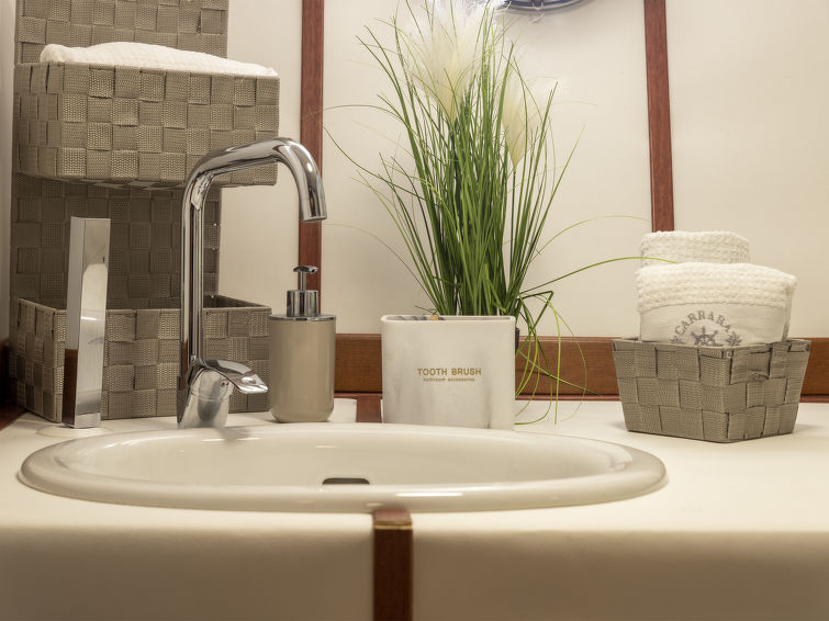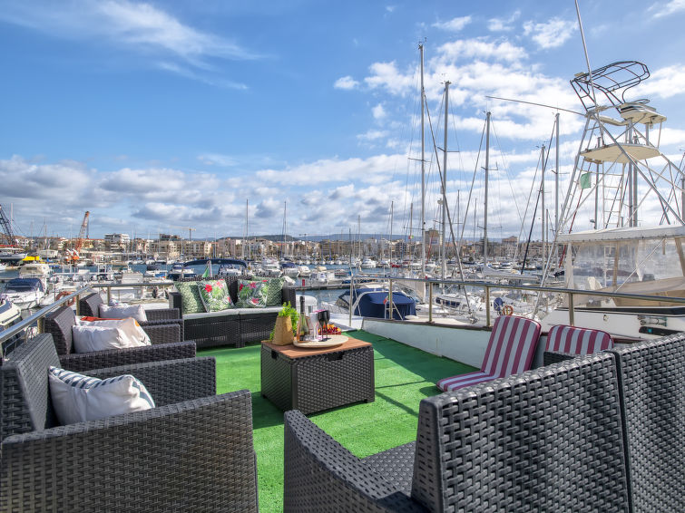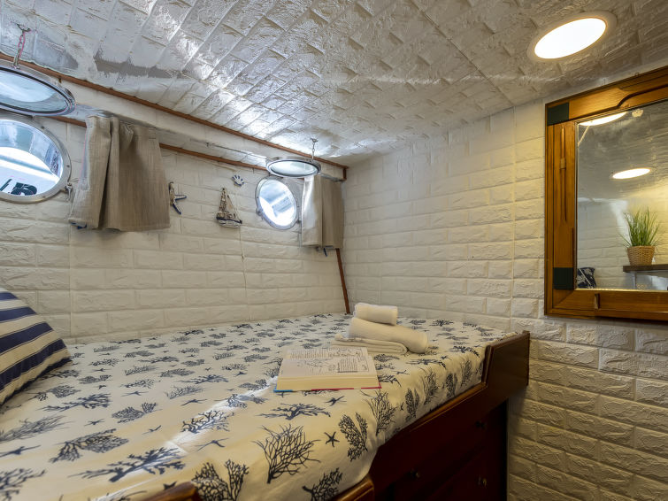 House boat "Alicudi", built in 1968. 400 m from the centre of Alghero, in a sunny position, 1 m at the seaside. In the house: solarium. Motor boat (on order). Cook on request (extra). Beverage service and breakfast (included). Parking at 50 m. Shop 1.4 km, supermarket 500 m, restaurant 600 m, bar 500 m, bus stop 700 m, sandy beach "San Giovanni" 480 m. Nearby attractions: Bosa 46 km, Stintino 46 km, Porto Torres 34 km, olbia 140 km, Castelsardo 72 km. Please note: car recommended. Historic boat of the scientific communicator Piero Angela, parties are organised.7-room mobile home. Open living/dining room with 1 double sofabed and satellite TV (flat screen). Exit to the veranda. Small kitchen (4 hot plates, oven, toaster, kettle, microwave, electric coffee machine). On the lower ground floor: 2 rooms, each room with 1 french bed. 2 rooms, each room with 1 bed. 2 rooms, each room with 1 x 2 bunk beds. 3 showers/bidet/WC. Air-conditioning, forced-air heating. Parquet floors. Very beautiful view of the sea. Facilities: washing machine. Internet (WiFi, free). Parking (1 car). IT090003B9000F3108