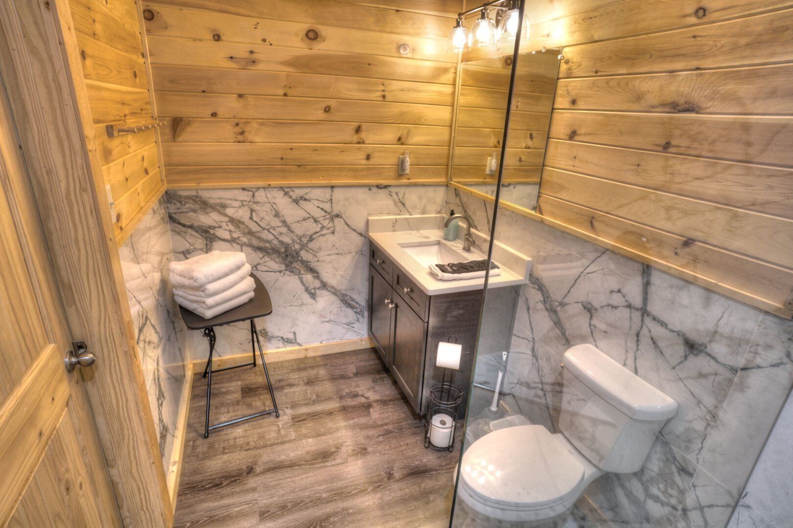 Allure is designed for maximum comfort. The upstairs includes a fully stocked kitchen, fireplace, large state of the art TV, king size bed with a bathroom, shower and jacuzzi. You can enjoy the open floor plan or close the stylish barn doors for privacy. The downstairs is designed for entertaining, with another large high definition TV, huge couch, a 7 foot slate pool table, wet bar and refrigerator and a bathroom featuring a gorgeous new walk-in shower for two. The downstairs features two curtained queen size pod beds (each with their own TV in the pod!) and twin bunk beds, so there’s plenty of space for everyone to play, relax and dream.