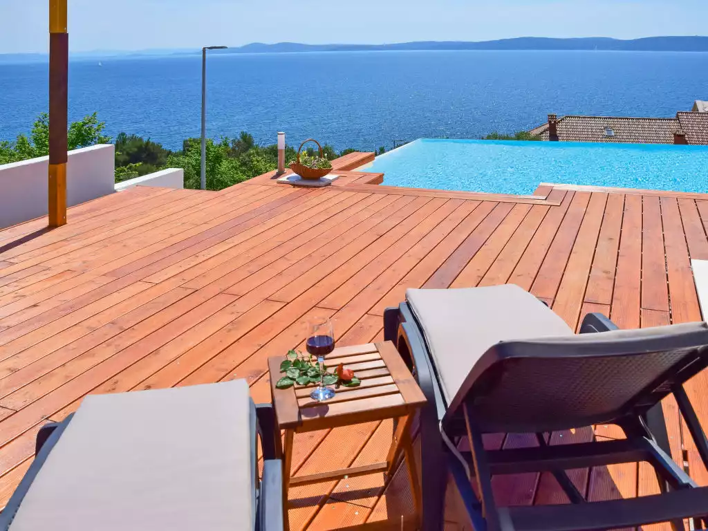 Okrug Gornji (Čiovo) 7 km from Trogir: Beautiful villa "Andrea", 2 storeys. In the district of Mavarštica 1.8 km from the centre of Okrug Gornji, in a quiet, sunny, elevated position, 170 m from the sea, 170 m from the beach. Private: property 400 m2 (fenced), swimming pool angular (7 x 5 m, depth 150 cm, seasonal availability: 20.Apr. - 16.Nov.) with internal staircase. Outdoor shower, terrace (90 m2), garden furniture, barbecue. In the house: internet access, washing machine. Parking (for 2 cars) at the house on the premises. Shop 400 m, restaurant 900 m, bus stop 2.3 km, pebble beach 280 m, rocky beach 170 m.4-room villa 120 m2 on 2 levels. Modern furnishings: living/dining room 65 m2 with satellite TV (flat screen), air conditioning. Exit to the terrace, to the swimming pool. Open kitchen (4 hot plates, oven, dishwasher, microwave, freezer, electric coffee machine). Sep. WC. Upper floor: 1 room with 1 bed (80 cm, length 200 cm), 1 x 1 bunk beds (80 cm, length 200 cm). 1 room with 1 french bed (160 cm, length 200 cm). 1 room with 1 french bed (180 cm, length 200 cm), bath/WC, separate WC and with corner bath. Shower/WC. Deck chairs. Marvellous view of the sea. Facilities: safe, hair dryer. Internet (WiFi, free). Parking (fenced).