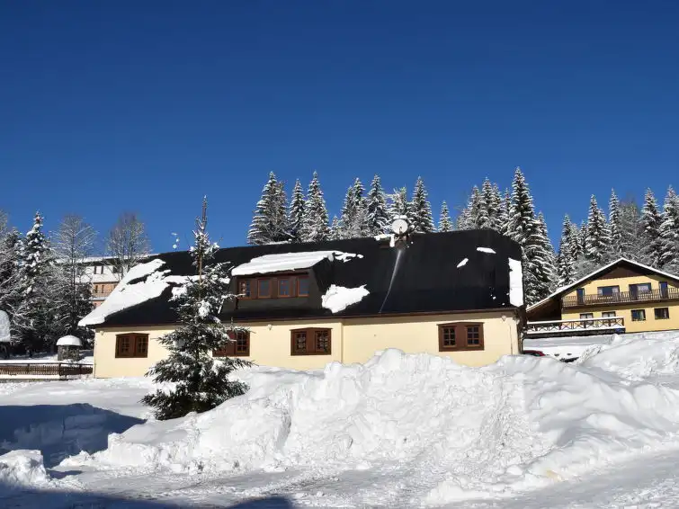 Very beautiful chalet "Anenské údolí", 2 storeys, detached. In a quiet, sunny position, 100 m from the edge of the forest, 800 m from the skiing area, 150 m from the stream, in a cul-de-sac. Private: large garden (not fenced) with lawn. Table tennis, patio, terrace, garden furniture, barbecue, fireplace, children's playground (slide, swing, sandbox). In the complex: WiFi, trampoline, storage room for bicycles, storage room for skis, central heating system. Parking at the house. Supermarket 1 km, restaurant 700 m, café, bicycle rental 1 km, bus stop "Harrachov centrum" 1 km, railway station "Harrachov" 3 km, outdoor swimming pool 1.6 km, indoor swimming pool 1.7 km. Golf course (9 hole) 3 km, tennis 2 km, indoor tennis centre 2 km, minigolf 1.5 km, walking paths from the house 10 m, cycle lane 1 km, chair lift 800 m, slopes, ski rental 800 m, ski school, children's ski school, cross country ski track 600 m, children's playground 600 m. Nearby attractions: bobová dráha 500 m, Muzeum skla, Hornické muzeum, Šindelka 2 km, Mumlava vodopád 3 km, Skokanské můstky 1 km, Jilemnice, Jablonec nad Nisou 25 km, Liberec - zoo, aquapark, Ještěd 40 km. Well-known ski regions can easily be reached: Harrachov 800 m, Příchovice 9 km, Paseky na Jizerou, Rokytnice nad Jizerou 15 km. Well-known lakes can easily be reached: Vodní nádrž Souš 12 km. Hiking paths: Anenské údolí, Harrachova cesta, Krakonošova cesta, Čertova hora, Běžecký lyžařský areál Jakuszyce 5 km. Please note: baby equipment on request. The property consists of 5 apartments. Each apartment has a living room.5-room chalet 400 m2 on 2 levels. Spacious and bright, partly with sloping ceilings, very beautiful and tasteful furnishings: living/dining room with dining table, kitchen corner and satellite TV. 1 room with 2 beds and 1 double bed. Living/dining room with dining table and satellite TV. 1 room with 2 beds and 1 x 2 bunk beds, 1 double bed. Kitchenette (2 ceramic glass hob hotplates, kettle, microwave). 2 showers/WC. Upper floor: large living/dining room with 1 sofabed, dining table, kitchen corner and satellite TV. 1 room with 2 beds and 1 double bed. Living/dining room with 1 sofabed, dining table, kitchen corner and satellite TV. 1 room with 2 beds and 1 double bed. 1 room with 1 sofabed and 1 x 2 bunk beds, 1 double bed, dining table, kitchen corner and satellite TV. 3 showers/WC. Large terrace, patio, lawn. Terrace furniture, barbecue (portable). View of the garden and the countryside. Facilities: children's high chair, baby cot (extra). Internet (WiFi, free). Please note: suitable for families. Non-smoking house.
