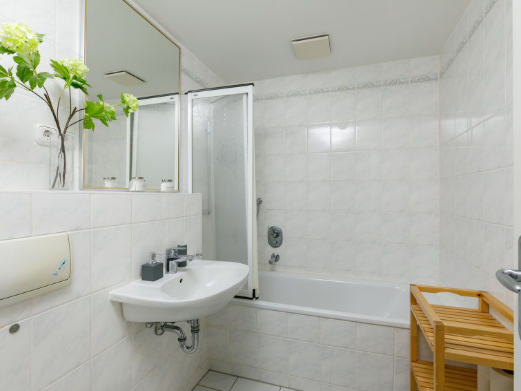 Apartment block "Bellevue". On the outskirts, 1 km from the centre of Zinnowitz, on a slope, 1.1 km from the sea, 1.1 km from the beach. In the house: central heating system. Communal covered parking. Parking space or garage only for small to medium-sized cars. Dimension: height 200 cm. Supermarket 1.1 km, restaurant 1.1 km, bakery 1.1 km, café 1.1 km, bus stop 2 km, railway station 1.9 km, sandy beach 1.1 km, thermal baths "Bernsteintherme" 1.9 km. Marina 1.1 km, golf course (18 hole) 25 km, surf school 1.7 km, tennis 850 m, minigolf 1.4 km."App. 48 Residenz Bellevue", 2-room apartment 57 m2 on 1st floor. Modern and cosy furnishings: 1 room with 1 double bed. Living/dining room with 1 double sofabed and satellite TV (flat screen), radio and CD-player. Kitchen (oven, dishwasher, kettle, microwave). Bath/shower/WC. Balcony. Balcony furniture. Facilities: children's high chair, baby cot for up to 2 year olds. Internet (WiFi, free). Garage on the property (1 car), height 200 cm. Please note: non-smoking house. Smoke alarm.