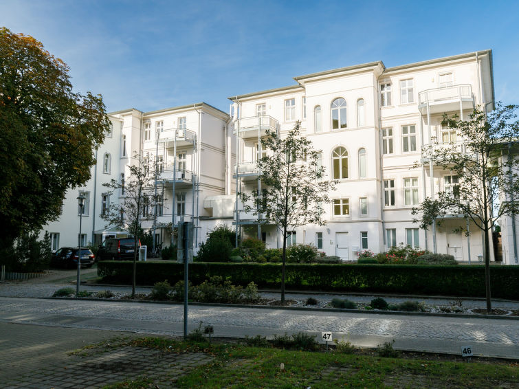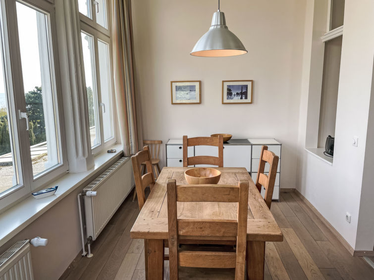 Apartment block "Zinnowitzer Hof", 3 storeys. In the resort Zinnowitz, 50 m from the sea, 50 m from the beach. In the house: lift, central heating system. Supermarket 750 m, restaurant 20 m, bakery, café, bus stop 550 m, railway station 1.5 km, sandy beach 50 m, thermal baths "Bernsteintherme" 1.1 km. Marina 2.5 km, golf course (18 hole) 25 km, surf school 650 m, tennis 650 m, minigolf 1.1 km."App.6 Zinnowitzer Hof", 2-room apartment 60 m2 on 2nd floor. Beautiful and cosy furnishings: living/dining room with 1 double sofabed and cable TV (flat screen). Exit to the balcony. 1 room with 1 double bed. Kitchenette (4 hot plates, oven, toaster, kettle, electric coffee machine). Bath/WC. Balcony. Balcony furniture. Beautiful view of the sea. Parking (1 car). Please note: non-smokers only. Smoke alarm.