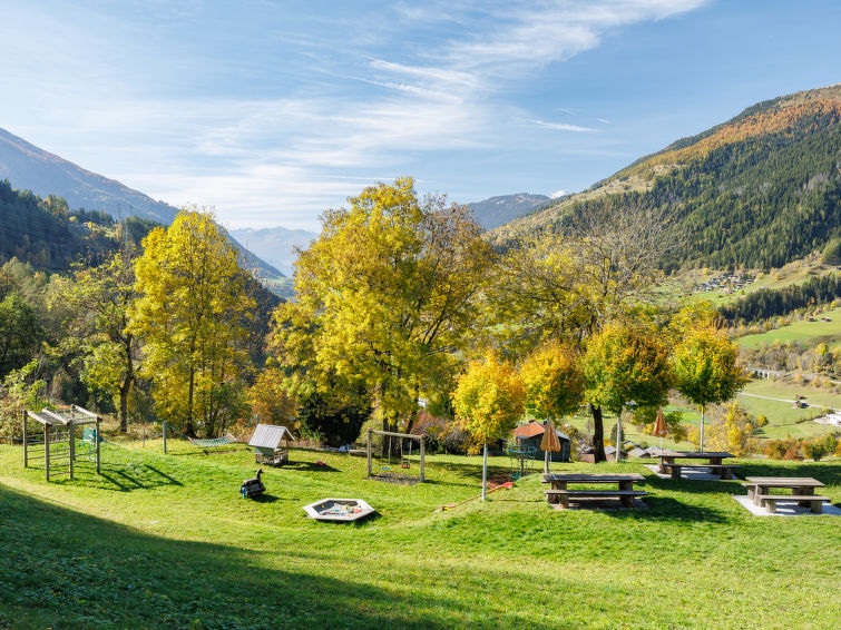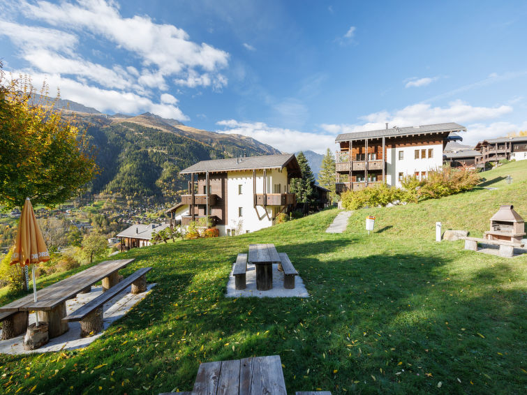 Cosy, rustic holiday village "Aragon", 1'200 m a.s.l.. 21 houses in the resort. On the outskirts, 500 m from the centre of Ernen, in a quiet, sunny position on a slope, 4 km from the skiing area. For shared use: table tennis, barbecue, fireplace, children's playground. In the house: storage room for bicycles, storage room for skis, central heating system, washing machine, tumble dryer (for shared use, extra). Motor access to the grounds (mountain road). In Winter: please take snow chains, 4x4 car recommended in winter. Communal covered parking. Shop 500 m, bus stop 100 m. Golf course (18 hole) 25 km, tennis 4 km, indoor tennis centre 4 km, sports centre 4 km, gondola lift 4 km, skisport facilities 4 km, ski rental 4 km, ski bus stop 100 m, ski school 4 km, cross country ski track 4 km. Well-known ski regions can easily be reached: Aletsch Arena 4 km, Bellwald 12 km. Hiking paths: Landschaftspark Binntal 10 km. The new hanging bridge connects the two hiking estates of Ernen and Bellwald and provides access to the national cycle route nr. 1 (road of the Rhone glacier lake to Lake Geneva). Between Ernen and Mühlebach, the bridge provides direct access to the Matterhorn Gotthard train."Aragon T100", 3-room apartment 78 m2 on 2 levels on 1st floor. Cosy furnishings: living/sleeping room with 1 fold-away bed, open-hearth fireplace and cable TV (flat screen), radio. Exit to the balcony. Open kitchen (oven, dishwasher, 4 ceramic glass hob hotplates) with dining table. Bath/WC. Upper floor: 1 double bedroom. 1 room with 2 beds. Shower/WC. Large balcony. Balcony furniture. Very beautiful view of the mountains, the valley and the countryside. Facilities: baby cot (extra). Internet (WiFi, free). Garage space n 107. Please note: non-smokers only. Maximum 1 pet/ dog allowed.