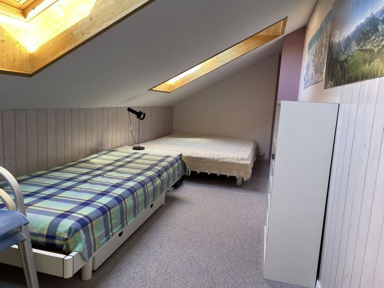 Spacious 1,5 room apartment (47sqm) with open-plan kitchen (among other things furnished with filter coffee machine, fondue- and raclette-set). Living room with 2 beds (90x200cm), flat screen-TV, radio and telephone. Adjoining room under the roof slant with 1 single bed (90x190cm) and 1 kingsize bed (140x200cm). Bathroom with shower and toilet. Covered wooden balcony. Baby cot (68x105cm) incl. bed linen and highchair available.