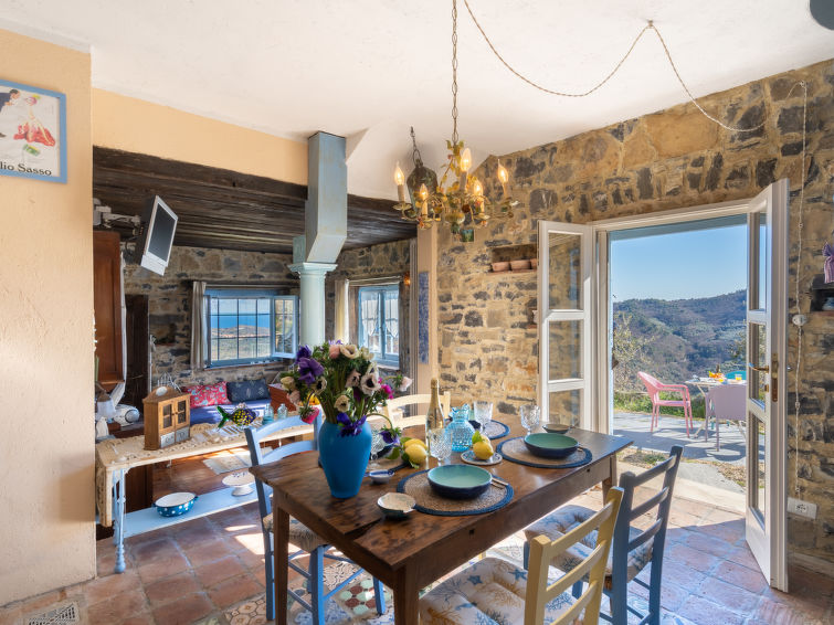 Beautiful, cosy single-family house "Azzurra", surrounded by trees and vineyards. 800 m from the centre of Pietrabruna, 10 km from the centre of San Lorenzo al Mare, 28 km from the centre of San Remo, in a secluded, elevated position on a slope, 9.5 km from the sea, in the countryside. Private: large, beautiful terraced garden, 3'000 m2 with wildlife garden and trees, swimming pool (8 x 4 m, depth 150 cm, seasonal availability: 01.Apr. - 01.Nov.) with internal staircase. Outdoor shower, pergola, terrace, fireplace, pool maintenance by the owner/gardener. 200 m long bumpy, steep, narrow motor access. 30 m footpath to the house. Parking (for 2 cars) at 30 m on the premises. Shop 800 m, supermarket 10 km, restaurant, bus stop 800 m, railway station "Imperia Oneglia" 19 km, sandy beach "San Lorenzo al Mare" 10 km. Cycle lane 10 km."Azzurra (PTB145)", 3-room house 60 m2 on 2 levels. Rustic and tasteful furnishings: living/sleeping room with 1 bed (80 cm), TV, CD-player and wood-burning stove. Open kitchen (oven, dishwasher, 4 gas rings, toaster, freezer, electric coffee machine) with dining table. Shower/WC. Heating available only from 30.10. to 30.04. Upper floor: (spiral staircase), 1 open room with 1 double bed (160 cm). 1 open room with 1 french bed (160 cm). Exit to the terrace. Shower/WC. Gas heating. Wooden floors, natural stone floors. Large terrace, patio, porch. Terrace furniture, barbecue, deck chairs (5). Marvellous distant view of the sea and the countryside. Facilities: washing machine, iron, mosquito net. Internet (WiFi). Please note: not suitable for small children. Smoke alarm, fire extinguisher. IT008041C2HMX9CX38