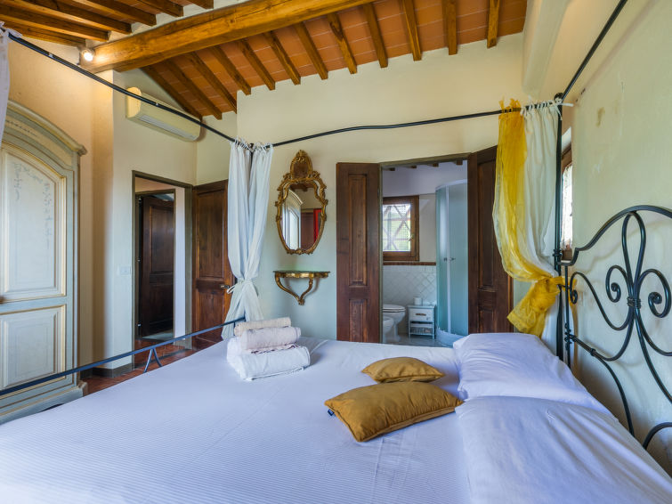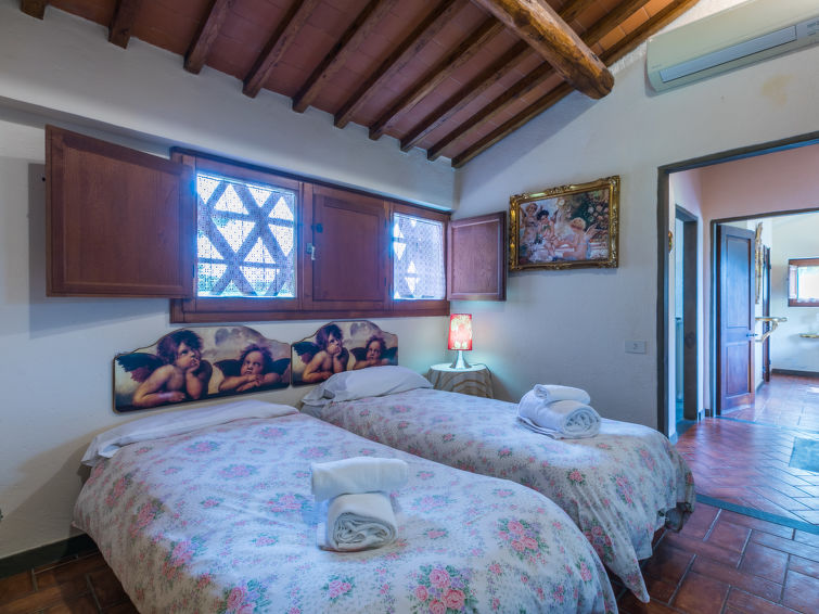 The property, unique for its location, is located in a green oasis in the Chianti area, more precisely in the charming town of Badia a Passignano, known throughout the world for the Antinori vineyards. Halfway between Florence and Siena this old renovated farmhouse, with all comforts, offers numerous possibilities to tourists who decide to stay there. Recommended for those who want to rest and enjoy the country life made of tranquility, fresh air, relaxation and good wine, recommended for families who will be able to let their children play free and without worries, recommended for animal lovers and finally also recommended for those who intend to use it as a base and then tour much of Tuscany beautiful, cosy working farm "Badia a Passignano", surrounded by vineyards. 4 apartments in the property. Above Badia a Passignano 10 km from the centre of San Donato in Poggio, 30 km from the centre of Firenze, 40 km from the centre of Siena, in a quiet, sunny position on top of a hill, in the countryside. For shared use: garden with plants and flowers, swimming pool (6 x 12 m, depth 140 - 220 cm, seasonal availability: 05.Apr. - 25.Oct. pool opening hours: 08:00-21:00). Outdoor shower, garden furniture, barbecue, children's playground, pool maintenance by the owner/gardener. In the house: internet access, heating to be paid on the spot, heating available only from 01.Nov. - 15.Apr.. Cook on request. 1 km long motor access (via unmade road). Parking at the house. E-charging station. Shop 2 km, grocery 4 km, supermarket 4 km, restaurant 2 km, bar 2 km, bus stop 2 km. Golf course (18 hole) 15 km, riding stable 2 km. Nearby attractions: Panzano in Chianti 10 km, Barberino Val D'Elsa 12 km, Greve in Chianti 16 km, Castellina in Chianti 20 km, Radda in Chianti 21 km, San Gimignano 32 km.4-room house 95 m2 on 2 levels. Very comfortable and cosy furnishings: living room with dining table and satellite TV. Exit to the garden. Open kitchen (4 hot plates, oven, dishwasher, toaster, kettle, freezer, electric coffee machine). Shower/WC. Upper floor: 1 double bedroom with air conditioning. 1 double bedroom with shower/bidet/WC and air conditioning. 1 room with 2 beds and air conditioning. Exit to the balcony. Bath/shower/bidet/WC. Heating (extra), air-conditioning (extra). Patio, large garden. Terrace furniture, barbecue. Beautiful view of the countryside. Facilities: washing machine, children's high chair, baby cot for up to 2 year olds. Internet (WiFi, free). Parking at the house. Maximum 1 pet/ dog allowed. Solarium area with private sun beds above the swimming pool. IT048054B5BY2GUULF