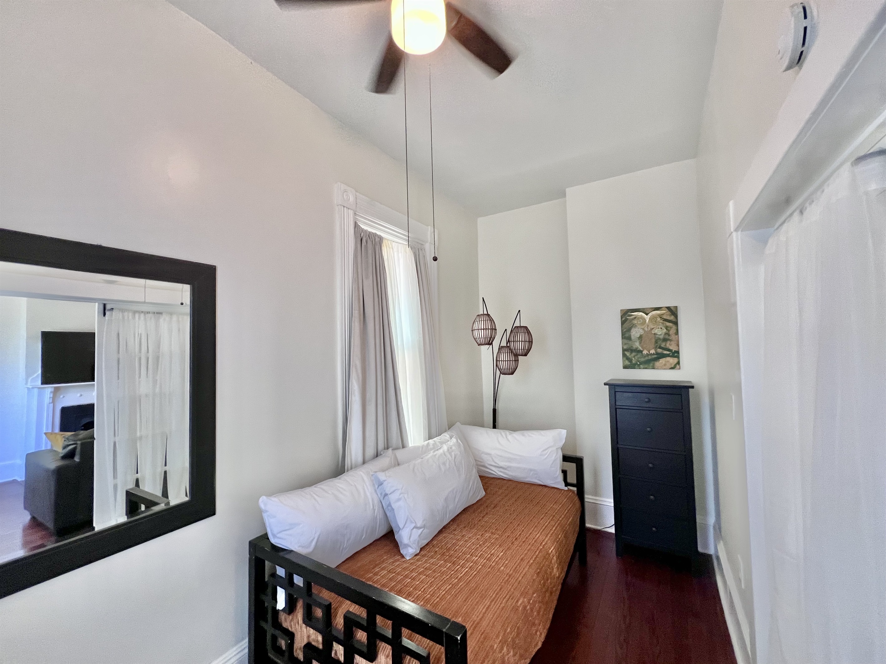 Features a king bed in the master bedroom, a small but private second bedroom off living room with original window as a door to entry of balcony. Situated on the upper balcony level of an awesome Victorian home divided into a spacious upstairs suite separate from the downstairs suite with many original features. A gorgeous, serene environment, in walking distance to the heart of downtown Savannah and steps to Forsyth Park.