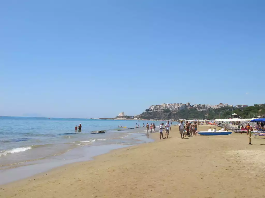 Lido di Fondi: Residence "Fondi". 34 houses in the residence. In the district of Lido di Fondi 8 km from the centre of Sperlonga, 5 km from the centre of Terracina, 120 km from the centre of Napoli, in the residential district, traffic calmed area, 400 m from the sea. Shop 2 km, supermarket 2 km, bus stop 200 m, railway station "Fondi" 13 km, ferry "Terracina" 6 km, sandy beach 400 m."Barbie", 3-room semi-detached house 45 m2, on the ground floor. Comfortable furnishings: living/sleeping room with 1 double sofabed, dining table, satellite TV and air conditioning. Exit to the garden, to the terrace. 1 double bedroom. 1 room with 1 bed and 1 x 2 bunk beds. Exit to the garden. Open kitchen (oven, 4 gas rings, toaster, kettle, freezer). Shower/bidet/WC. Gas heating, air-conditioning. Terrace roofed, garden. Terrace furniture, barbecue, deck chairs. Facilities: washing machine. Internet (WiFi, free). Parking (fenced) at the house. Please note: non-smoking house. Maximum 1 pet/ dog allowed. Private entrance. IT059007C23UYRNV5R