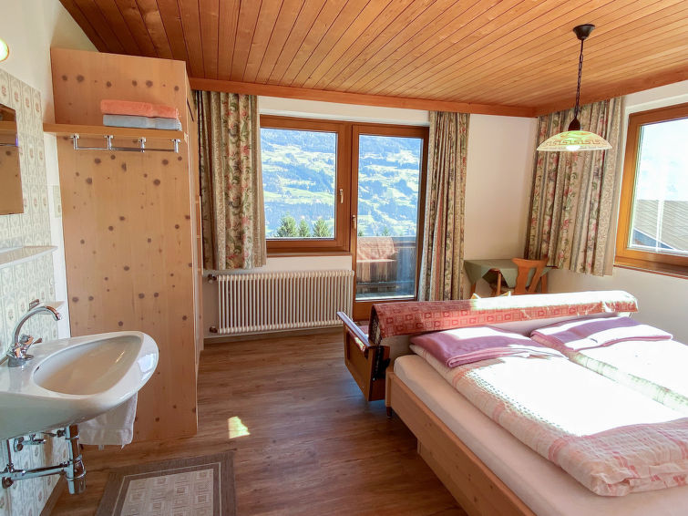 House "Baumannerhof", 820 m a.s.l.. 3.3 km from the centre of Fügen, 10 km from the centre of Kaltenbach, 4.5 km from the skiing area, in a cul-de-sac. In the house: storage room for skis, ski boot dryer. 2 km long steep, narrow motor access. In Winter: please take snow chains. Parking (for 5 cars) on the premises. Supermarket 3.3 km, bus stop "Fügen Gemeindeamt/Apotheke" 3.1 km, railway station "Fügen-Hart i.Z. Bahnhof" 3.5 km. Golf course (18 hole) 2 km, ski lift 4.5 km, gondola lift 4.5 km, ski bus stop 5 km, sled run 3.5 km. Well-known ski regions can easily be reached: Spieljochbahn Fügen, Ski Optimal Hochzillertal Kaltenbach. The apartment on the 2nd floor is partly used by holiday guests who use the separate kitchen on the ground floor (access via a common hallway). The use of fireworks is prohibited on New Year's Eve.6-room apartment 150 m2 on 2 levels. Simple and rustic furnishings: large dining room with satellite TV (flat screen). Kitchen (oven, dishwasher, 4 ceramic glass hob hotplates, kettle, electric coffee machine) with small dining table. Upper floor: 4 double bedrooms, each room with hand-basin. Exit to the balcony. Sep. WC, bath/shower/WC. Heating. Carpet. Balcony. Balcony furniture. Beautiful panoramic view. Facilities: children's high chair, baby cot. Internet (WiFi, free). Please note: non-smoking house. There is another apartment on the ground floor that is used by other guests.