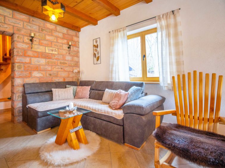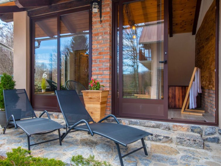 Lukovo 13 km from Fužine: Single-family house "Bazak", 2 storeys, surrounded by trees. In the hamlet Ravno, in a quiet, sunny position, 24 km from the sea, 14 km from the lake. Private: property 2'000 m2 with lawn 130 m2. Hot tub, barbecue house (swing). In the house: internet access, infrared sauna. Motor access (800 m via unmade road). Parking (for 3 cars) at the house on the premises. Shop 11 km, restaurant 1 km, bus stop 14.1 km, pebble beach 24 km, public bathing area 24 km. Riding stable 17 km, walking paths from the house 600 m, cycle lane 650 m. Well-known lakes can easily be reached: Bajer 14 km. The tap water has no drinking water quality.3-room house 83 m2. Living/dining room with open-hearth fireplace and satellite TV. Open kitchen (1 hot plate, oven, dishwasher, 3 gas rings, kettle, freezer, electric coffee machine). 2 showers/WC. Upper floor: 1 room with 1 bed (90 cm, length 190 cm), 1 double bed (2 x 90 cm, length 190 cm). Exit to the balcony. 1 room with 2 beds (90 cm, length 190 cm). Wood heating. Balcony 4 m2. Deck chairs. Facilities: baby cot, hair dryer, logs (free). Internet (WiFi, free). 1 small pet/ dog allowed. One shower/WC on the ground floor is located outside the house.