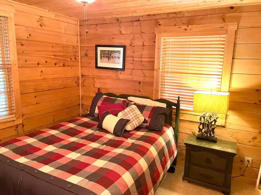 On the main level there is an open floor plan with vaulted ceilings, two bedrooms, bathroom, and eat in kitchen. Enjoy the wood burning fireplace while watching a movie or while cooking in the fully equipped kitchen. On the main level there are 2 bedrooms, one with a queen bed and the other bedroom with 1 twin over twin bunk and 1 twin over full bunk. The master suite is upstairs with an electric fireplace and a private newly remodeled bathroom.