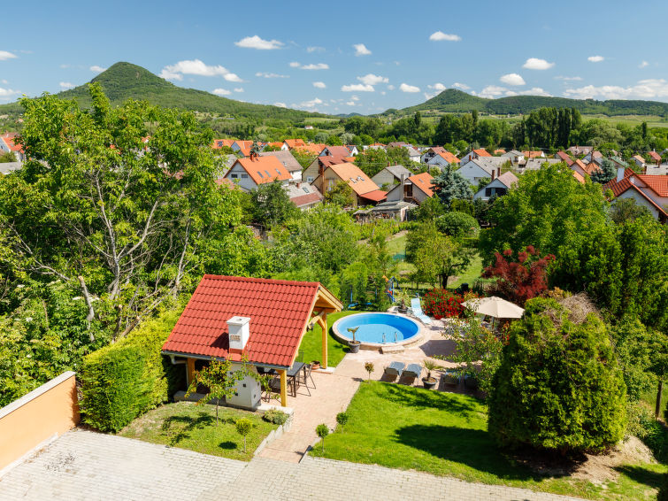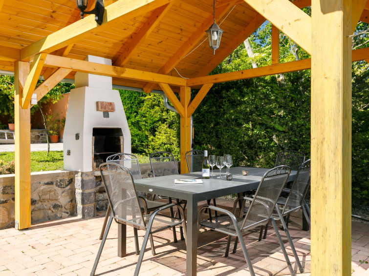 Badacsonytomaj 25 km from Keszthely: Beautiful 2-family house "Beate". 1.4 km from the centre of Badacsonytomaj, 4.5 km from the centre of Badacsony, 38 km from the centre of Keszthely, on a slope, in the residential district, 2 km from the lake, 1.8 km from the beach. For shared use: property 900 m2 (fenced) with lawn. Children's playground. Private: terraced garden with lawn, swimming pool (4 x 2 m, depth 1 cm, seasonal availability: 01.May. - 30.Sep.). Garden furniture, parking (for 3 cars) on the premises. Shop 800 m, grocery 300 m, supermarket 11 km, restaurant 1 km, bakery 1 km, bicycle rental 1 km, grass beach 2 km, thermal baths "Hévíz" 30 km. Tennis 2 km, riding stable 4 km, cycle lane 1.5 km, children's playground 550 m. Nearby attractions: Festetics Castle 26 km, Tihany 37 km, Balatonfüred Annagora Aquapark 38 km, Tapolca Lake Cave Visitor Centre 10 km, Szigliget Castle 88 km, Folly Arboretum 3 km. Please note: the owner lives in the same residence."Beate", 5-room apartment 120 m2 on 1st floor. With sloping ceilings, modern furnishings: living room with satellite TV and air conditioning. Exit to the balcony. 2 rooms, each room with 2 beds (90 cm, length 200 cm). 2 rooms, each room with 1 french bed (160 cm, length 200 cm). Open kitchen (oven, dishwasher, 4 ceramic glass hob hotplates, toaster, kettle, microwave, electric coffee machine) with dining table. Shower/WC, sep. WC. No heating option. On the lower ground floor: kitchen (4 hot plates, oven, dishwasher) with separate WC. Exit to the garden. Balcony, patio roofed. Balcony furniture, barbecue, deck chairs (6). Facilities: washing machine, baby cot. Internet (WiFi, free). Please note: non-smokers only. Private entrance. MA19011110