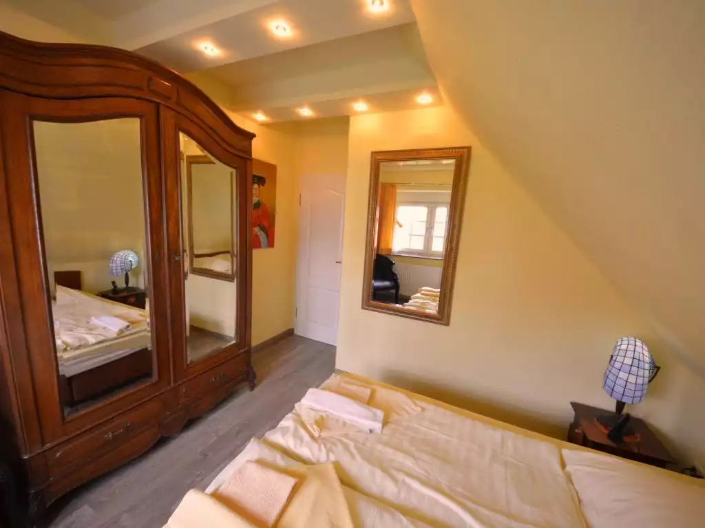 Gager 3 km from Gross-Zicker: Comfortable semi-detached house. On the outskirts, 300 m from the centre of Gager, 300 m from the sea, 3 km from the beach. In the house: sauna, central heating system. Bread roll service possible. Grocery, restaurant 50 m, bus stop "Gager, Am Hafen" 550 m, railway station 21 km, sandy beach 3 km, outdoor swimming pool 14 km, indoor swimming pool 14 km. Golf course (18 hole) 31 km, riding stable 6 km. Both semidetached houses with their own garden part. The ground floor and the bathrooms upstairs have underfloor heating."Bel Monte", 5-room semi-detached house 140 m2 on 3 levels, on the ground floor. Comfortable and tasteful furnishings: living/dining room with Scandinavian wood stove and satellite TV (flat screen), video and hi-fi system. Exit to the garden, to the terrace. Open kitchen (oven, dishwasher, 4 ceramic glass hob hotplates, microwave, electric coffee machine). Shower/WC. Floor heating. Upper floor: 2 double bedrooms. 1 double bedroom with bath/bidet/WC and satellite TV. Shower/bidet/WC. Top floor: 1 double bedroom with sloping ceilings with shower/WC. Terrace partly roofed. Terrace furniture, barbecue. Facilities: washing machine, dryer, sauna, children's high chair, logs (free). Internet (WiFi, free). Parking (2 cars) at the house. Please note: non-smoking house. Maximum 1 pet/ dog allowed. Smoke alarm, fire extinguisher. Some rooms on the first floor offer views of the coast and the yacht harbour. On request and after pre-order a third parking space can be provided for EUR 4.00 / day.