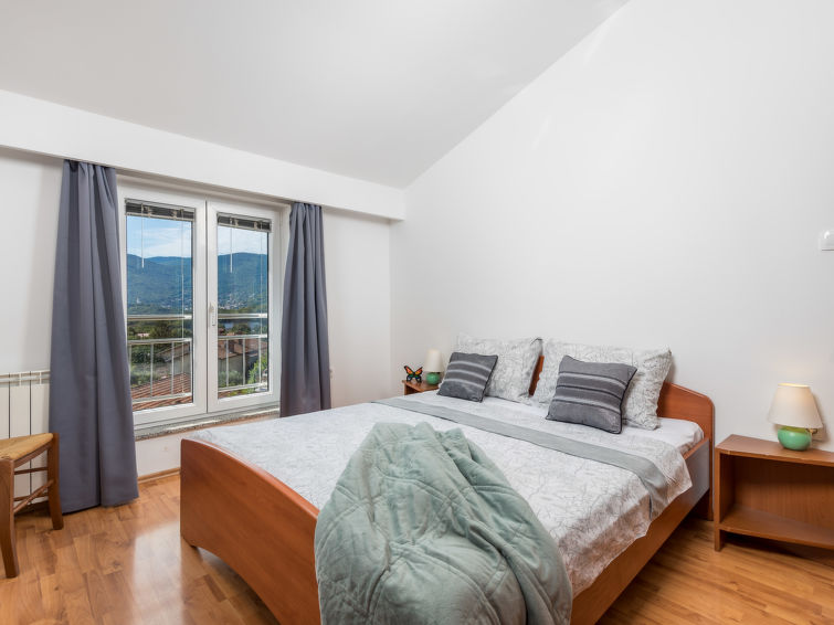 Apartment block "Bella Vista". 6 km from the centre of Opatija, 11 km from the centre of Ičići, on a slope, 3 km from the sea, 3 km from the beach, in a cul-de-sac, in the countryside. For shared use: property 1'200 m2 with flowers and trees, swimming pool heated (7 x 4 m, depth 120 - 160 cm, seasonal availability: 29.Apr. - 30.Nov. pool opening hours: 08:00-22:00). Outdoor shower, terrace, barbecue. In the house: internet access, washing machine, tumble dryer (for shared use, extra). Parking at the house on the premises. Shop 200 m, bus stop 1.2 km, pebble beach 3 km."Bella Vista", 2-room apartment 43 m2 on 2nd floor. Living/dining room with 1 double sofabed (160 cm, length 200 cm), satellite TV and air conditioning. Exit to the terrace. 1 room with 1 french bed (160 cm, length 200 cm). Open kitchen (dishwasher, 4 ceramic glass hob hotplates, toaster, kettle, microwave, electric coffee machine). Shower/WC. Oil heating, air-conditioning, forced-air heating. Terrace 6 m2. Terrace furniture. Facilities: Internet (WiFi, free). Maximum 1 pet/ dog allowed.