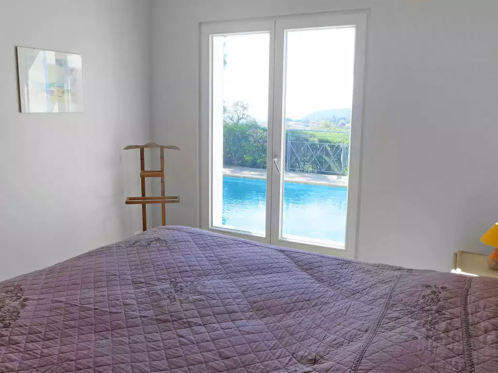 Villa "Belle Vue". On the outskirts, 1.8 km from the centre of Cavalaire sur Mer, in a quiet position on top of a hill, 2 km from the sea. Private: property, well-kept garden (fenced), swimming pool angular (8 x 4 m, depth 60 - 200 cm, seasonal availability: 08.Apr. - 07.Oct.) with alarm system. Outdoor shower, boules, planted inner courtyard. Motor access to the house. Parking (for 4 cars) on the premises, single garage. Shop 2 km, grocery 2 km, supermarket 2.5 km, shopping centre 10 km, restaurant 2 km, bar 2 km, bakery 2 km, café 2 km, bus stop "place du parc" 280 m, sandy beach "Tamaris" 2 km, park "Aqualand" 26 m, diving center 2 km. Marina 2 km, sailing school 2 km, minigolf 12 km. Nearby attractions: Azur Park, Paint-ball 12 km, Bowling à Port-Grimaud 13 km, St-Tropez 17 km, Ste-Maxime 24 km. Hiking paths: Sentier du Dattier 7.6 km, Sentier du littoral 8700 km, Toulon 60 km.5-room house 140 m2, south facing position. Spacious, fully renovated in 2016, comfortable and modern furnishings: large living/dining room with panoramic window with satellite TV (flat screen), hi-fi system. Exit to the terrace, to the swimming pool. 1 room with 1 double bed (160 cm, length 200 cm), shower/WC and double hand-basin. 1 room with 1 double bed (160 cm, length 200 cm). Exit to the swimming pool. 1 room with 1 double bed (160 cm, length 200 cm), bath/WC and hand-basin. Exit to the swimming pool. 1 room with 1 double bed (160 cm, length 200 cm), hand-basin and shower/WC. Open kitchen (oven, dishwasher, 3 induction hot plates, toaster, kettle, freezer, electric coffee machine, Capsules for coffee machine (Senseo) extra, combination microwave). Exit to the terrace, to the swimming pool. Shower/WC, sep. WC, double hand-basin. Electric heating, air-conditioning. Large terrace 30 m2. Terrace furniture, barbecue, deck chairs (4). Beautiful view of the sea and the valley. Facilities: washing machine, iron, hair dryer. Internet (WiFi, free). Parking (fenced 4 cars). Please note: TV only FR. Smoke alarm.