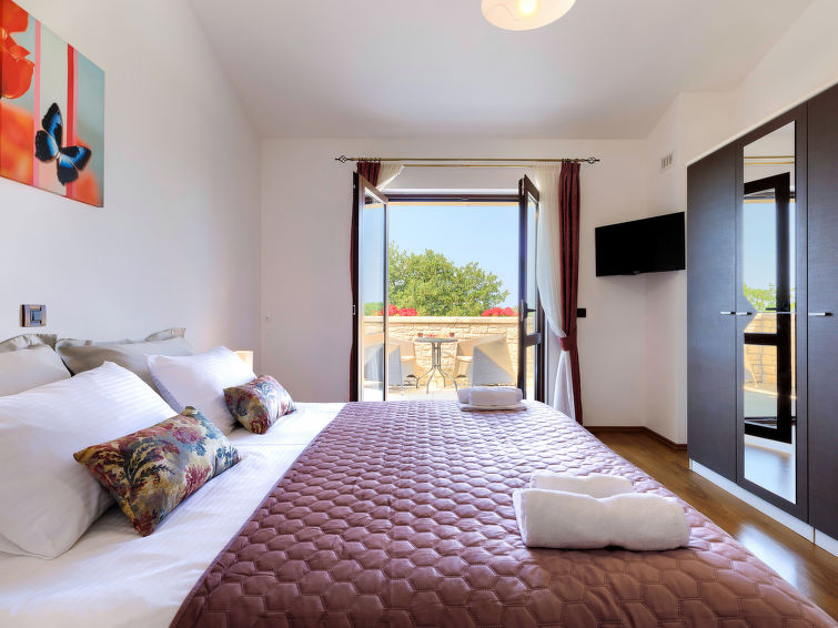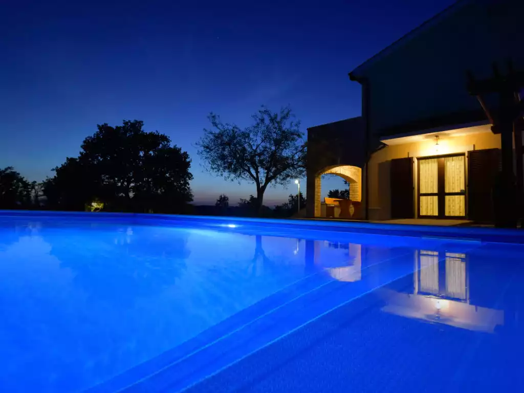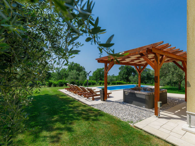 Sv.Lovreč 12 km from Poreč: Beautiful villa "Blog 1", 2 storeys. In the hamlet Vosteni 2 km from the centre of Sv.Lovreč, in a quiet position, 7 km from the sea, in the countryside. For shared use: children's playground (slide, swing). Private: property 2'000 m2 (fenced) with lawn, swimming pool angular, heated (24 m2, depth 140 cm, seasonal availability: 01.Apr. - 01.Nov.) with internal staircase. Outdoor shower, hot tub, pergola, barbecue. In the house: internet access, washing machine. Parking (for 3 cars) at the house on the premises. Shop 2 km, supermarket 12 km, restaurant 150 m, bus stop 5.2 km, pebble beach 12 km, rocky beach 12 km. Walking paths from the house 50 m, cycle lane 100 m. Nearby attractions: Lim valley 7 km, aquapark 17 km, amusement park 17 km. Please note: suitable for families. The owner does not accept any youth groups. For shared use: children's playground (slide, swing) at 30 m. Swimming pool heated (extra). Youth groups are not allowed. Possibility of buying autochthonous food products (on request, extra).5-room villa 140 m2 on 2 levels. Living/dining room with open-hearth fireplace (only for decoration), satellite TV (flat screen), air conditioning. Exit to the terrace. 1 room with 2 beds (90 cm, length 200 cm), satellite TV (flat screen), air conditioning. 1 room with 2 beds (90 cm, length 210 cm), air conditioning. Open kitchen (oven, dishwasher, 4 ceramic glass hob hotplates, microwave). Shower/bidet/WC. Upper floor: 1 room with 1 double bed (2 x 90 cm, length 200 cm), bath/bidet/WC, with corner bath and satellite TV (flat screen), air conditioning. 1 room with 1 double bed (2 x 90 cm, length 200 cm), shower/bidet/WC and satellite TV (flat screen), air conditioning. Exit to the terrace. Forced-air heating. Terrace 7 m2, roofed, terrace 6 m2. Terrace furniture, deck chairs. Distant view of the sea. Facilities: Internet (WiFi, free).