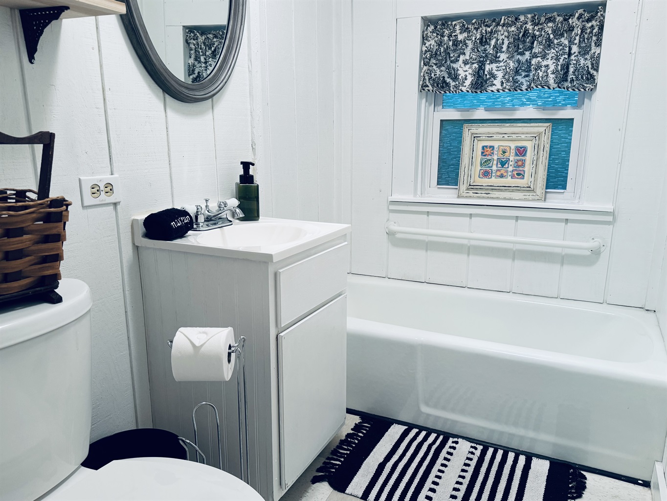 Entering through the front door, Guests are welcomed into the front sunroom porch that has glass and screened windows, a beautiful hardwood floor and 2 ceiling fans. There is a gorgeous farmhouse table that seats 8 for an experience of outdoor dining with all of the views through the glass! On the other side of the front sunroom, there is a cozy reading nook with a twin size comfy mattress. Probably the guest-favorite highlight of the home, you will enjoy reading your favorite novel here! Or take a long nap and unwind while connecting with nature :)