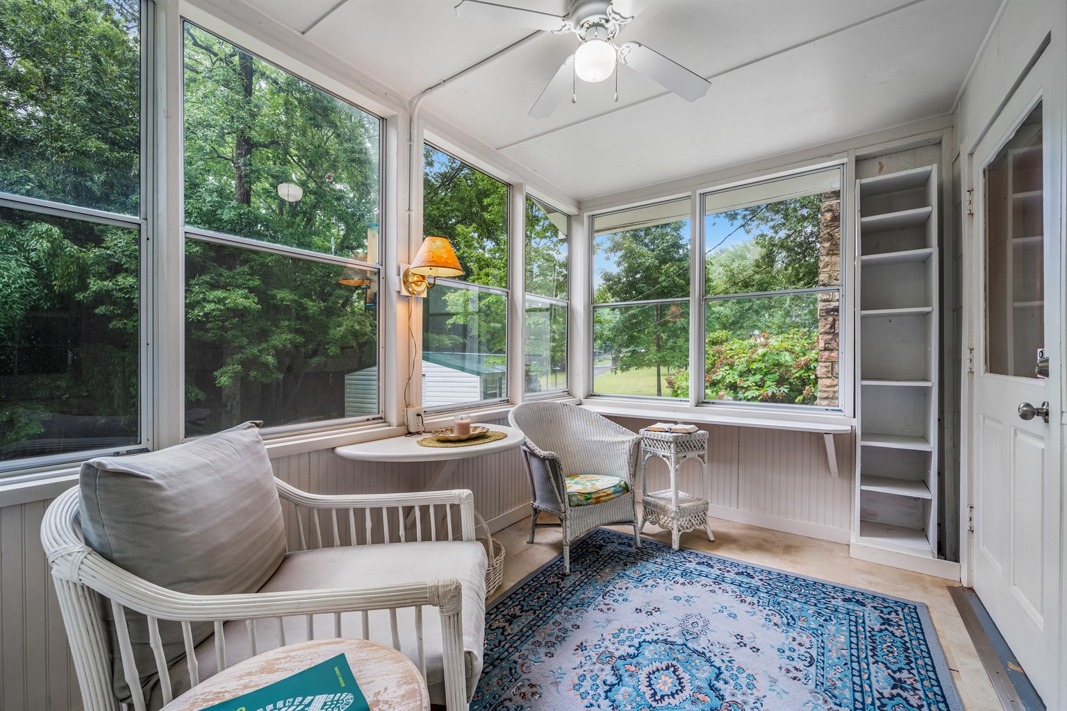 The back sunroom is located between the kitchen and the open deck. With comfortable seating and breeze from the ceiling fan, this delightful space offers another perfect gathering place to unwind and connect with nature :)