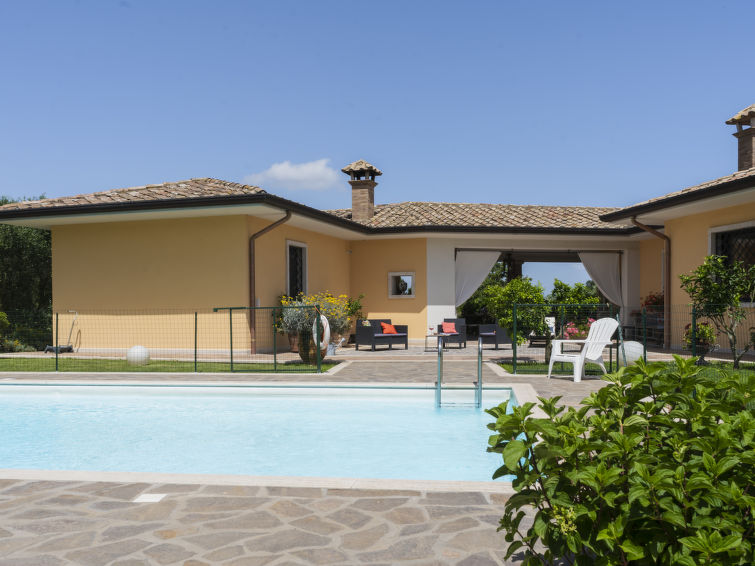 Beautiful, comfortable house "Borgo Sacramento", detached. Property composed of main house and outbuilding 1.4 km from the centre of Marta, 10 km from the centre of Montefiascone, 100 km from the centre of Roma, 40 km from the sea, 1.5 km from the lake. Private: property 50'000 m2, garden (not fenced) wildlife garden and trees, swimming pool (10 x 5 m, depth 125 - 150 cm, seasonal availability: 01.May. - 10.Oct.). Patio (50 m2), garden furniture, barbecue. In the house: bicycle rental. Parking (for 4 cars) on the premises, single garage. Shop 1.4 km, supermarket 1 km, bus stop 3 km, sandy beach "Moltalto Di Castro" 40 km, thermal baths "Terme Dei Papi" 22 km, bathing lake "Lago di Bolsena" 1.5 km. Nearby attractions: Viterbo 20 km, Bolsena 23 km, Civita Di Bagno Regio 26 km, Orvieto 30 km, Pitigliano 34 km."Borgo Sacramento", 5-room house 180 m2. Comfortable and stylish furnishings: large living room with open-hearth fireplace and Scandinavian wood stove (only for decoration). Exit to the terrace. Living room with open-hearth fireplace and kitchen corner. 2 rooms, each room with 1 french bed, shower/WC and air conditioning. 1 room with 1 bed, 1 french bed, shower/WC and air conditioning. 1 room with 1 bed, 1 double bed and air conditioning. Large, open kitchen (oven, dishwasher, 5 gas rings, toaster, kettle, microwave, freezer, electric coffee machine) with dining table. Shower/WC. Gas heating. Facilities: washing machine, iron, mosquito net, children's high chair, baby cot for up to 2 year olds. Internet (WiFi, free). Please note: non-smokers only. When there are less than the maximum number of guests staying at the property, the annex will not be available for use. IT056034B5XXDP6O57