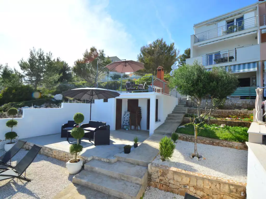 Okrug Gornji (Čiovo) 6 km from Trogir: Apartment house "Borka". 2 km from the centre of Okrug Gornji, in a quiet, sunny position, 30 m from the sea, 30 m from the beach, in a cul-de-sac. For shared use: property 250 m2 (fenced). Terrace (50 m2), garden furniture, barbecue. In the house: internet access. Parking at the house on the premises. Shop 850 m, restaurant 1 km, bus stop 2 km, rocky beach 30 m. Tennis 2.5 km. Please note: airfield 10 km from the property.2-room apartment 35 m2 on 1st floor, south facing position. Living/dining room with 1 double sofabed (140 cm, length 200 cm), satellite TV (flat screen), air conditioning. Exit to the terrace. 1 room with 1 french bed (160 cm, length 200 cm), satellite TV (flat screen). Open kitchen (oven, 4 ceramic glass hob hotplates, freezer, electric coffee machine). Shower/WC. Terrace 20 m2 partly roofed. Terrace furniture. Marvellous view of the sea. Facilities: Internet (WiFi, free).