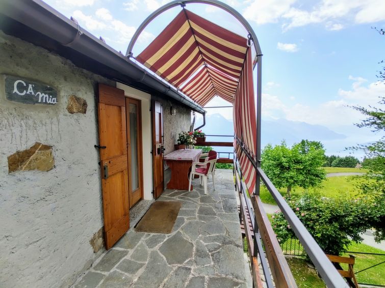 Rustic 3-family house "Mia e Giulia", 1'115 m a.s.l.. Above Peglio, in the hamlet Bodone 12 km from the centre of Gravedona, 60 km from the centre of Como, 64 km from the centre of Lecco, in an elevated position on a slope, 12 km from the lake, in the countryside. For shared use: property (fenced) with meadow. 5 km long narrow motor access (mountain road). Stepped path to the house. Parking at the house. Shop 5 km, supermarket 13 km, bus stop 5 km, railway station "Como" 60 km, pebble beach "Lido di Gravedona" 12 km, outdoor swimming pool 12 km. Marina 12 km, golf course (18 hole) 39 km. Nearby attractions: Chiesa Santa Maria del Tiglio Gravedona, Agriturismo Zertin, Palazzo Gallio-Gravedona, Parco Valle Albano, Lake Como Adventure Park, Gravedona. Well-known lakes can easily be reached: Lago di Mezzola, Lago di Lugano. Hiking paths: Monte la Motta, Monte Duria, Alpe Paregna."Cà Mia", 3-room apartment 40 m2, on the top floor, south facing position. Object suitable for 3 adults + 1 child. Rustic and tasteful furnishings: living/dining room with dining table, satellite TV and wood-burning stove. Exit to the balcony. 1 room with 1 french bed (160 cm). 1 small room with 1 bed and 1 pull-out bed. Open kitchen (oven, 4 gas rings, toaster, microwave, freezer, electric coffee machine). Shower/WC. Gas heating. Balcony, west facing position balcony, south facing position. Balcony furniture, deck chairs (2). Marvellous panoramic view of the lake. Facilities: children's high chair, baby cot for up to 2 year olds. Internet (WiFi, free). Please note: maximum 3 pets/ dogs allowed. Private entrance. IT013178C28SPLGBPT