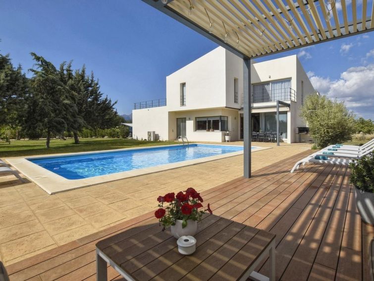 Binissalem: Modern, cosy house "Caleu", built in 2010, surrounded by trees and fields. On the outskirts Binissalem, in a quiet, sunny position, 35 km from the sea, in the countryside. Private: property 1'400 m2, orchard, beautiful garden to relax, swimming pool angular (10 x 5 m, seasonal availability: 01.Mar. - 31.Oct.). Outdoor shower, patio, pergola, garden furniture, barbecue. In the house: internet access, WiFi, air conditioning, washing machine. Parking on the premises. Supermarket 2.5 km, restaurant 2.5 km, bus stop 900 m, sandy beach "Puerto Alcudia" 35 km. Please note: car recommended. Suitable for families, suitable for seniors baby equipment on request (included). The owner does not accept any youth groups. Loading and unloading of baggage is possible at the holiday house. Airfield 40 km from the property."Caleu", 6-room house 325 m2. Object suitable for 10 adults. Comfortable and modern furnishings: living/dining room with satellite TV with 1 french bed (150 cm, length 200 cm). 1 double bedroom with 1 french bed (150 cm, length 200 cm). 1 double bedroom with 1 french bed (150 cm, length 200 cm). 1 double bedroom with 2 beds (90 cm, length 200 cm). 1 double bedroom with 2 beds (90 cm, length 200 cm). Kitchen-/living room (4 hot plates, oven, dishwasher, toaster, kettle, microwave, freezer, grill, electric coffee machine). Bath/WC, shower, shower/WC, bidet, bath/shower/WC. Patio 100 m2. Terrace furniture, barbecue, deck chairs. View of the swimming pool, the garden and the countryside. Facilities: washing machine, dryer, iron, children's high chair, baby cot for up to 2 year olds, hair dryer. Internet (WiFi, free). Suitable for families. ETV/3391 // Reg. Nr.: ESFCTU00000702200016873600000000000000000000ETV/33910