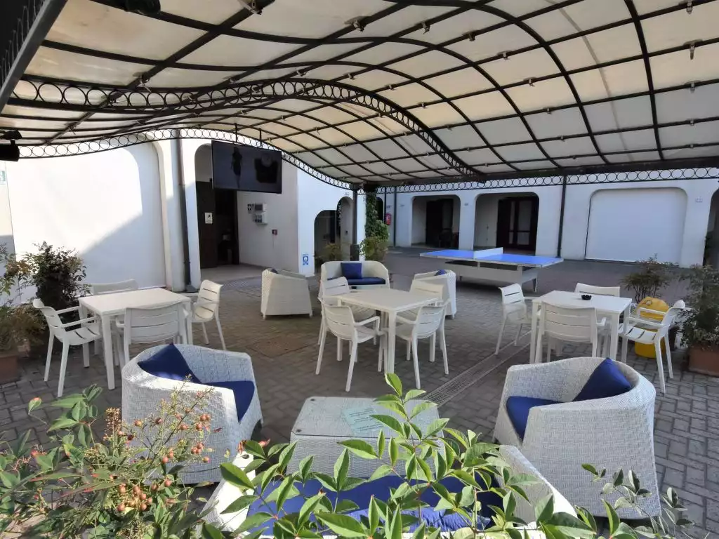 Lidi Ferraresi: Comfortable resort "Michelangelo", 3 storeys. 68 apartments in the residence. 350 m from the centre of Lido di Spina, 2.2 km from the centre of Lido degli Estensi, in the residential district, 600 m from the sea, 600 m from the beach. For shared use: swimming pool (300 m2, depth 140 cm, seasonal availability: 01.May. - 30.Sep.). Children's pool, hot tub, children's playground (sandbox). In the complex: reception, restaurant, bar, WiFi, washing machine, tumble dryer (for shared use, extra). Parking. Shop 350 m, bus stop 500 m, railway station "Ravenna" 29 km, sandy beach 600 m. Nearby attractions: Comacchio 10 km, Ravenna 30 km, Mirabilandia 45 km, Ferrara 62 km. Please note: entertainment in the season. Suitable for families, baby equipment on request (extra). Additional accommodations can be booked."Caliente", 3-room apartment 60 m2 on 2 levels on 1st floor, north-east facing position. Comfortable furnishings: living/sleeping room with 2 sofabeds, dining table and satellite TV. Exit to the loggia. Open kitchen (dishwasher, 4 induction hot plates, microwave, electric coffee machine). Shower/bidet/WC. Upper floor: 1 double bedroom. Exit to the loggia. 1 room with 1 bed and 1 x 2 bunk beds. Shower/bidet/WC. Air-conditioning (extra). Terrace furniture, covered balcony. View of the swimming pool and the garden. Facilities: safe, hair dryer. Internet (WiFi, free). Parking (1 car) at the house. Please note: maximum 1 pet/ dog allowed. Private entrance. IT038006A1GTAUGIIJ