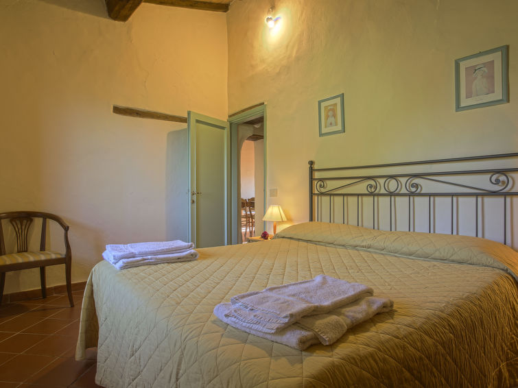 Agriturismo on a vinyard "Campiglia", surrounded by fields and vineyards. 6 apartments in the property. 2 km from the centre of Tavarnelle, 30 km from the centre of Firenze, 40 km from the centre of Siena, in a sunny, elevated position, 90 km from the sea, 90 km from the beach, in the countryside. For shared use: property 20 ha, well-kept garden (not fenced) with lawn and trees, lawn for sunbathing 1'000 m2, swimming pool fenced (15 x 7 m, depth 110 - 140 cm, seasonal availability: 25.Apr. - 31.Oct.). Outdoor shower, patio, garden furniture, barbecue, pool maintenance by the owner/gardener. In the house: washing machine (for shared use). 300 m long motor access (via unmade road). Parking on the premises. Shop 1 km, grocery 1 km, supermarket 1 km, restaurant 1 km, bar 1 km, bakery 1 km, 20 minute walk to the centre, bus stop 2 km, railway station "Barberino Zambra" 10 km, sandy beach "Cecina Mare" 90 km. Golf course (9 hole) 20 km, tennis 1 km, fishing possibilities 5 km. Nearby attractions: San Gimignano 22 km, Certaldo 15 km, Volterra 52 km, Montalcino 85 km. Please note: suitable for families, baby equipment (included). Groups of teenagers on request only. Local sale of farm products. The owner lives on the same property. All houses/apartments are individually designed/furnished."Campiglia", 3-room apartment 78 m2 on 1st floor. Spacious, renovated, practical and rustic furnishings: living/dining room with open-hearth fireplace, dining table and satellite TV. 2 double bedrooms. Open kitchen (oven, 4 gas rings, freezer, electric coffee machine). Shower/bidet/WC. Gas heating (extra). Natural stone floors. Patio. Terrace furniture, deck chairs. Very beautiful panoramic view of the countryside. Facilities: children's high chair, baby cot for up to 2 year olds. Internet (WiFi, free). Parking space n 2. Please note: non-smokers only. Maximum 1 pet/ dog allowed. Private entrance. IT048054B535R5VLB7