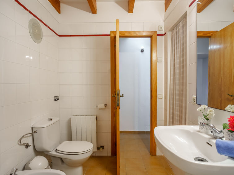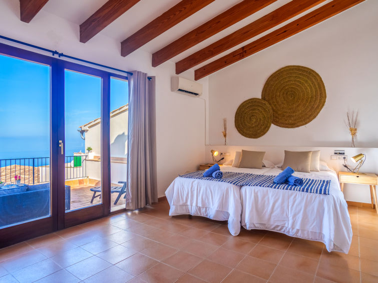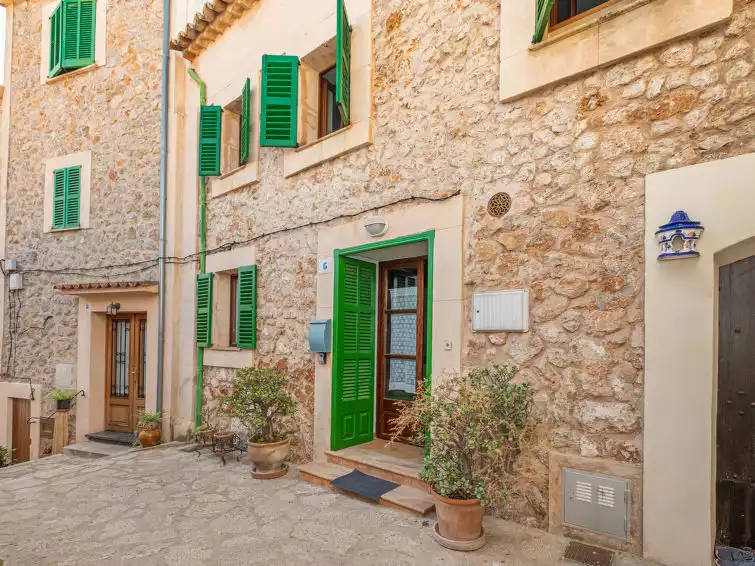 Banyalbufar: Large, rustic house "Can Masset", 3 storeys. In the centre of Banyalbufar, in an elevated position, excellent location: right in the centre but still quiet, 600 m from the sea, in a cul-de-sac. Private: courtyard. Outdoor shower, terrace, garden furniture, barbecue. In the house: internet access, WiFi, storage room for bicycles, central heating system. Very steep, narrow motor access. 20 m stepped path (15 steps) to the house. Roofed, parking (limited number of spaces), communal covered parking at 80 m. Parking space or garage only for small to medium-sized cars. Shop 250 m, restaurant, bar 20 m, bakery 80 m, café, pub garden 20 m, bus stop "Banyalbufar" 120 m, sandy beach "Playa de Palma" 25 km, shingle beach "Cala Banyalbufar" 650 m. Walking paths from the house, cycle lane 500 m. Nearby attractions: Bodega Son Vives, Esporles 10 km, Port des Canonge 11.7 km, Valldemossa 17 km, Estellencs 6.5 km, Palma de Mallorca Capital City 24 km. Hiking paths: Serra de Tramuntana, La Trapa, Estellencs, Ruta de Pedra en Sec. Please note: car recommended, no lift. Object suitable for 6 adults. The owner does not accept any youth groups. Airfield 35 km from the property. The apartment is located in a zone with limited traffic. Neighbourhood highly sensitive to noise. Quietness and good behaviour expected."Can Masset", 4-room house 110 m2 on 3 levels. Object suitable for 6 adults. Simple and practical furnishings: lounge with digital TV and flat screen. Kitchen-/living room (oven, dishwasher, 3 ceramic glass hob hotplates, microwave, freezer, electric coffee machine) with dining table, dining table. Exit to the terrace. Upper floor: 2 double bedrooms, each room with 1 french bed (150 cm, length 200 cm), fan. Bath/WC. 2nd upper floor: 1 large double bedroom with panoramic window with 2 beds (90 cm, length 190 cm), shower/WC, air conditioning and forced-air heating. Exit to the terrace. 2 large terraces. Terrace furniture, balcony furniture, barbecue, deck chairs (2), box-room. Very beautiful panoramic view of the sea and the town. Facilities: washing machine, iron, children's high chair, baby cot, hair dryer. Internet (WiFi, free). Parking (1 car) at 70 m. Please note: parking space for small car only. ETV9460 // Reg. Nr.: ESFCTU000007028000374795000000000000000000000ETV94604