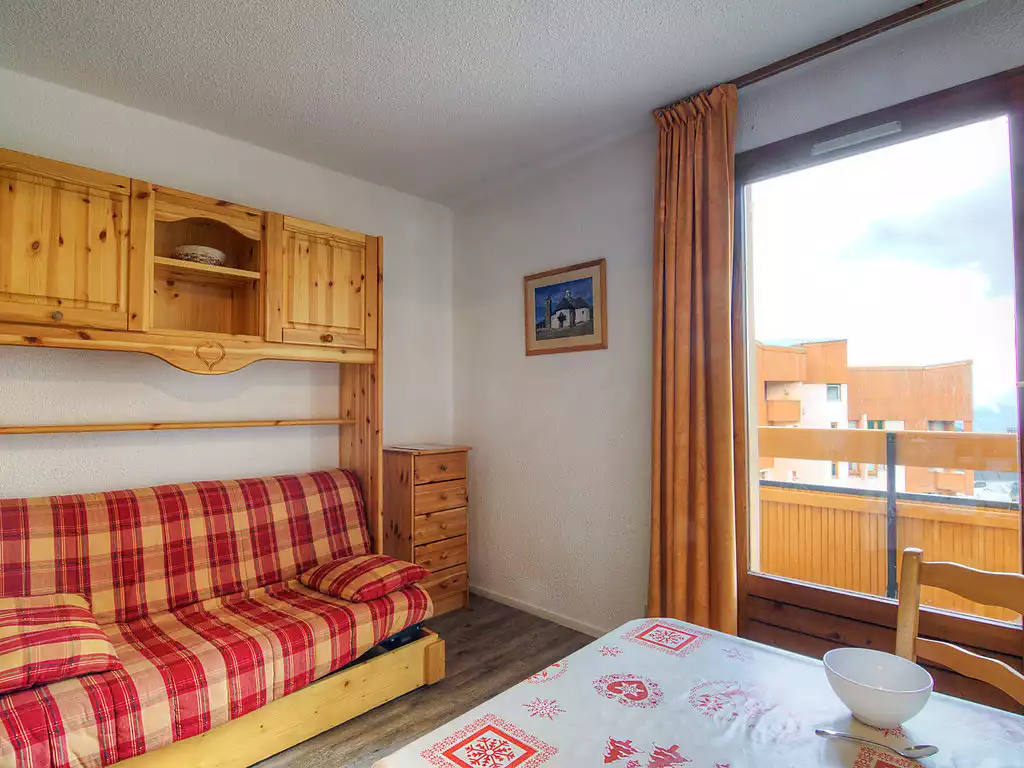 Residence "Les Carlines 1". In the district of Bruyères, in a central position, directly by the skiing area. In the complex: lift, storage room for skis. Public parking. Supermarket, restaurant, bakery 10 m, bus stop "Les Bruyères" 200 m. Sports centre 50 m, skisport facilities, slopes 50 m, ski school 20 m. Well-known ski regions can easily be reached: 3 Vallées."Carlines 1 - 46", 1-room apartment 24 m2 on 5th floor. Living/dining room with 1 double sofabed (140 cm, length 190 cm), TV (flat screen). Exit to the balcony. Entrance hall with 1 x 2 bunk beds (80 cm, length 190 cm). Kitchenette (2 hot plates, mini-oven, kettle, electric coffee machine). Bath/WC. Electric heating. Balcony, north-west facing position. Facilities: Internet (WiFi, extra). Please note: smoke alarm. Carlines 1.