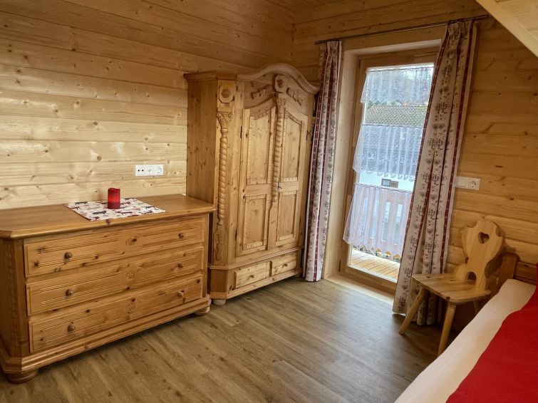 A family atmosphere in three comfortable log chalets. Largely self-sufficient energy supply with photovoltaic systems, infrared heating and Swedish stoves. Firewood comes from the property's small forest with a natural pond and stream. From approximately May 24, a chicken coop with outdoor enclosure will be available. Children can pet and feed the chickens and collect their own eggs. Small, child friendly resort, built in 2022. 3 houses in the residence. In the district of Mühlberg 2 km from the centre of Spiegelau, on a slope. For shared use: property 6'000 m2 with meadow, natural pond, swimming pool round (8 m diameter, seasonal availability: 15.May. - 30.Sep.). Patio. In the house: sauna, bicycle rental. Bread roll service. Shop 1 km, supermarket 2.5 km, bus stop "Palmberg" 1 km, railway station "Spiegelau" 3.5 km, outdoor swimming pool 2.5 km. Walking paths from the house 10 m, sled run 1 km. Nearby attractions: Nationalparkzentrum Neuschönau 17 km, Baumwipfelpfad 17 km, Passau 45 km. Well-known ski regions can easily be reached: Mitterfirmiansreut 31 km, Geißkopf 22 km, Großer Arber 37 km. Hiking paths: Nationalpark Bayerischer Wald 3 km. Please note: Loading and unloading of baggage is possible at the holiday house."Chalet Sven", 4-room chalet 120 m2 on 2 levels. Comfortable and wooden furniture furnishings: living/dining room with Scandinavian wood stove and satellite TV (flat screen). Exit to the balcony. 1 room with 1 double bed. Open kitchen (oven, dishwasher, 4 ceramic glass hob hotplates, toaster, kettle, microwave, electric coffee machine). Shower/WC. Upper floor: 1 room with 1 double bed. 1 room with 2 beds. Bath/WC, hydro massage bath, Sauna. Electric heating. Balcony, large terrace. Terrace furniture, balcony furniture. Beautiful view. Facilities: washing machine, dryer, baby cot. Internet (WiFi, free). Parking at 20 m. Please note: non-smoking house. Suitable for allergy sufferers, smoke alarm. Infrared heat panels. E-bike rental. Solarium.