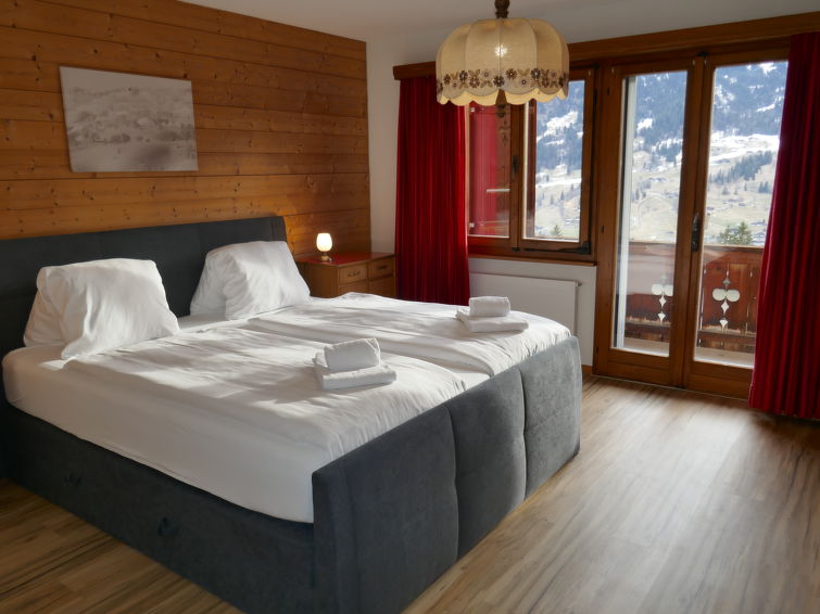 Beautiful, cosy apartment house "Chalet uf Duft". In the district of uf Tuft, 2 km from the centre, in a secluded, quiet position on a slope, in the countryside. In the house: central heating system. Steep, narrow motor access. In Winter: please take snow chains. Single garage at the house. Shopping centre 2 km, restaurant 2 km, bicycle rental 2.3 km, 30 minute walk to the centre, bus stop "Gaggi Säge" 300 m, railway station "Dorf" 1.9 km, outdoor swimming pool 3.5 km, indoor swimming pool 2 km. Golf course (9 hole) 4.8 km, tennis 4 km, minigolf 2.5 km, sports centre 2 km, walking paths from the house 30 m, gondola lift 2.6 km, ski rental 1.3 km, ski bus stop 300 m, ski school 1.3 km, children's ski school 1.3 km, children's playground 2 km. Well-known lakes can easily be reached: Thuner-/Brienzersee 20 km. Please note: ski bus (free of charge). The keys‘ handover takes place by the agency Int in Grindelwald, 3 km. The owner lives in the same residence. Neighbourhood highly sensitive to noise. Quietness and good behaviour expected.4-room apartment 110 m2, on the upper ground floor, south facing position. Spacious, practical and cosy furnishings: living room with satellite TV. Exit to the balcony, south facing position. 1 room with 2 beds (90 cm, length 200 cm). 1 room with 1 french bed (160 cm, length 200 cm). 1 room with 1 bed (180 cm, length 200 cm), bath/WC. Exit to the balcony, south facing position. Large kitchen-/living room (oven, dishwasher, 4 ceramic glass hob hotplates, toaster, kettle, electric coffee machine, raclette grill, fondue Set (cheese)). Shower/WC. Parquet floors, natural stone floors. Balcony, south facing position and west facing position. Balcony furniture. Marvellous view of the mountains and the countryside. Facilities: Internet (WiFi, free). Parking at the house. Please note: suitable for families. Non-smokers only. Private entrance, fire extinguisher.