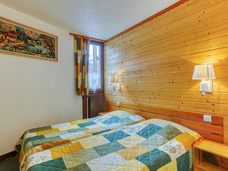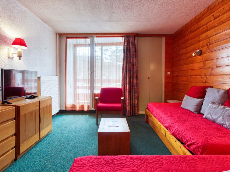 Beautiful residence "Chanteneige La Croisette". In the district of la Croisette, in the centre of la station, directly by the skiing area. In the complex: lift, storage room for skis, central heating system. Motor access to the house. Public parking 20 m. Bus stop "ARRET la croisette" 200 m. Sports centre, skisport facilities, slopes 20 m, ski rental 15 m, ski school, ski-kindergarten 50 m. Well-known ski regions can easily be reached: Domaine des 3 vallées. Please note: the photograph shows a typical example. Additional accommodations can be booked."Chanteneige 201", 2-room apartment 45 m2 on 2nd floor, south-west facing position. Comfortable and beautiful furnishings: large living/dining room with 1 bed (90 cm, length 190 cm), 1 pull-out bed (2 pers. 2 x 90 cm, length 190 cm), TV (flat screen). 1 room with 2 beds (90 cm, length 190 cm). Small kitchen (oven, dishwasher, 4 ceramic glass hob hotplates, kettle, microwave, electric coffee machine). Bathroom, sep. WC. Covered balcony. Beautiful view of the mountains. Facilities: washing machine. Internet (WiFi, extra). Please note: non-smokers only. Smoke alarm. 73257004526JP