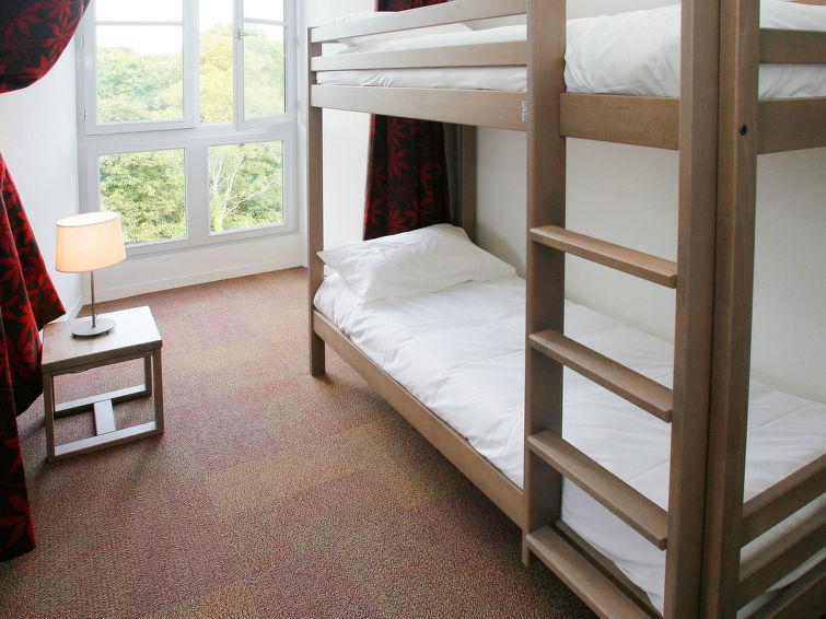 9 km from Carnac: Residence "Chateau de Keraveon", from the 17th century, surrounded by trees. 5 km from the centre, outside the resort, 4 km from the sea, 700 m from the beach, in the countryside. For shared use: property 10 ha with lawn. In the complex: washing machine, tumble dryer (for shared use, extra). Parking at the house. Shop 5 km, restaurant 5 km, bus stop 7 km, railway station "Auray" 20 km, sandy beach 4 km. Sports harbour 3 km, golf course (18 hole) 3 km, minigolf 2 km, riding stable 1 km. Please note: car recommended. Baby equipment on request (extra). The photograph shows a typical example. Additional accommodations can be booked."Odalys Référence Le Château de Kéravéon", 2-room apartment 25 m2. Beautiful furnishings: living/dining room with 1 pull-out bed (2 pers.), dining table and TV (flat screen). 1 room with 2 sleeping facilities. Kitchenette (dishwasher, 4 ceramic glass hob hotplates, toaster, kettle, electric coffee machine, combination microwave). Shower/WC. Electric heating. Facilities: children's high chair, baby cot for up to 3 year olds (extra). Internet (WiFi, free). Parking (fenced). Please note: maximum 2 pets/ dogs allowed. Smoke alarm.