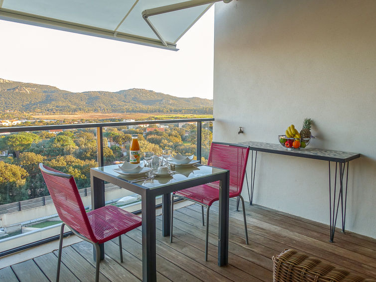 The Palazzu is composed of two buildings: the Bastion (lower part) and the Castle (upper part). Residence "Le Palazzu", built in 2016. 48 apartments in the residence. On the outskirts Porto-Vecchio, in an elevated position on a slope, 1 km from the sea, 10 km from the beach. For shared use: swimming pool (20 x 8 m, depth 160 cm, seasonal availability: 01.May. - 31.Oct.). Pool maintenance by the owner/gardener. In the complex: air conditioning. Steep motor access (via unmade road). Parking. Shop 1 km, grocery 400 m, supermarket 2.5 km, restaurant 400 m, bus stop 230 m, sandy beach 8 km. Marina 1 km, golf course (9 hole) 6 km, tennis 2 km, riding stable 3 km. Nearby attractions: Figari 21 km, Bonifacio 25 km, Solenzara 40 km, Iles Lavezzi. Hiking paths: L'Ospedale, Réserve Naturelle de Bonifacio. Please note: car recommended. Residence with electric gates."Château", 1-room studio 38 m2 on 2nd floor. Beautiful and cosy furnishings: living/dining room with 2 double sofabeds (160 cm, length 200 cm) (140 cm, length 190 cm), TV (flat screen). Open kitchen (oven, dishwasher, 4 ceramic glass hob hotplates, toaster, kettle, microwave, freezer, electric coffee machine). Exit to the terrace. Shower/WC. Electric heating, air-conditioning. Terrace 10 m2. Terrace furniture. View of the sea. Facilities: washing machine. Internet (WiFi, extra). Garage space n 57 (1 car). Please note: non-smokers only. Smoke alarm. Offer by a private individual according to Art. 155, IV of CGI. 2A24700131601