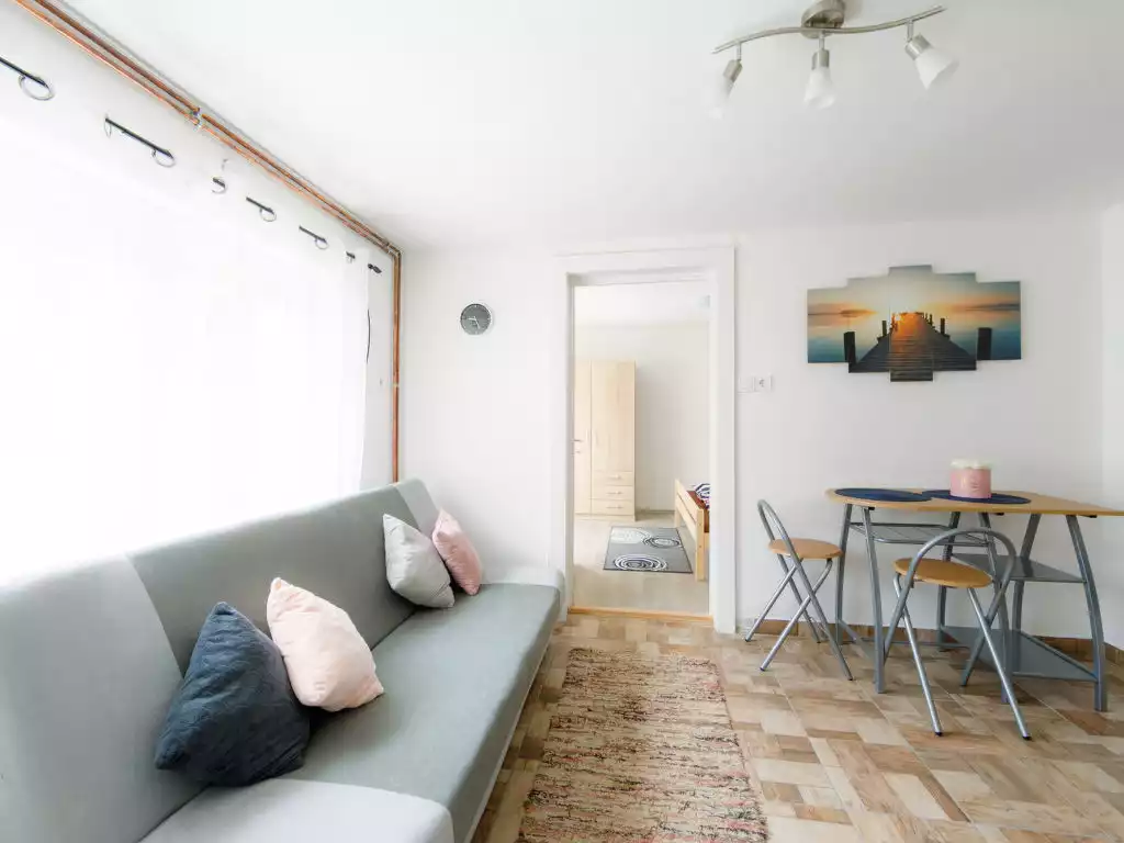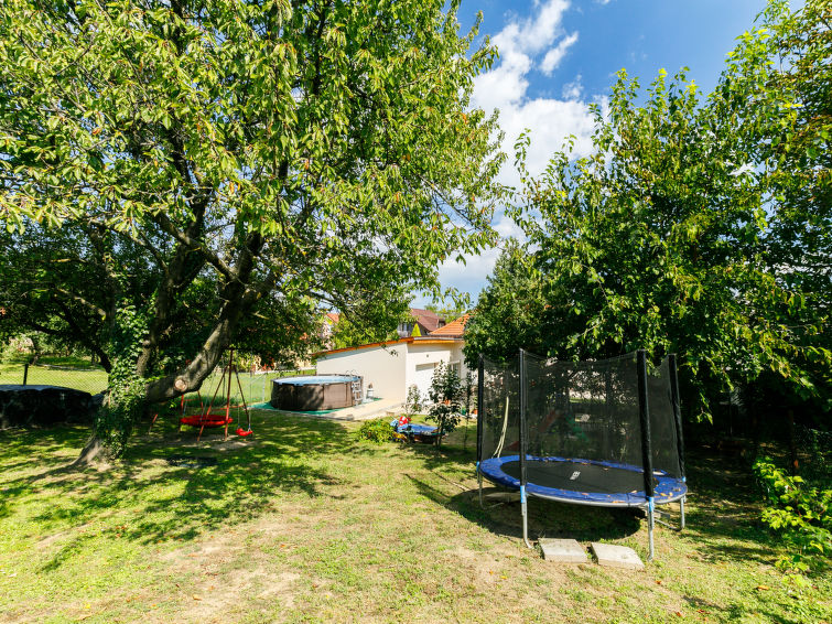 Fonyód 13 km from Balatonlelle: Small, cosy house "Cherry", renovated in 2021. On the outskirts, in a quiet position, 1.5 km from the lake, 1.9 km from the beach. For shared use: garden 600 m2 (fenced) flowers and trees. Private: swimming pool (above ground) (3 m diameter, seasonal availability: 01.Jun. - 15.Sep.). In the house: WiFi, central heating system, air conditioning, washing machine. Grocery 100 m, supermarket 2 km, restaurant 50 m, grass beach 1.5 km. Children's playground 50 m. Well-known lakes can easily be reached: Csisztapuszta thermal 6 km.2-room house 40 m2. Fully renovated in 2021, comfortable and modern furnishings: living/sleeping room with 1 pull-out bed and cable TV. 1 room with 1 french bed (160 cm, length 200 cm). Open kitchen (3 hot plates, oven, microwave, freezer). Shower/WC. Heating, solar energy heating. Terrace 20 m2, patio. Terrace furniture, barbecue, deck chairs (2). Facilities: baby cot for up to 3 year olds. Parking. MA21000170