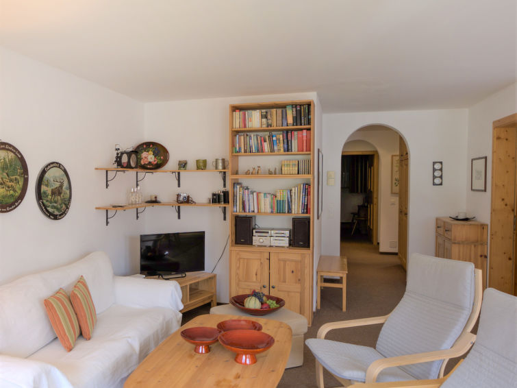 Silvaplana 6 km from St. Moritz: Beautiful apartment house "Chesa Dal Luf", 4 storeys. In the centre of Silvaplana, in a sunny position in the residential district, 500 m from the lake, in a cul-de-sac. In the house: table tennis, playroom, lift, storage room for bicycles, storage room for skis, central heating system, washing machine, tumble dryer, drying room. Communal covered parking. Grocery 20 m, restaurant 50 m, bakery 10 m, café, bus stop "Silvaplana Kreisel Mitte" 180 m, indoor swimming pool 6 km, lake Silvaplaner See 500 m. Surf school 1 km, tennis 1 km, sports centre 1 km, walking paths from the house 500 m, cycle lane 500 m, cable car 2 km, ski lift 2 km, ski rental 50 m, ski bus stop 180 m, ski school 1.4 km, children's ski school 1.4 km, cross country ski track 500 m, ice rink 1 km, children's playground 200 m. Nearby attractions: Nietzsche Haus in Sils Maria 5 km, Segantini Museum in St. Moritz 6 km. Well-known ski regions can easily be reached: Corvatsch - Furtschellas 2 km, Corviglia 6 km, Diavolezza - Lagalb 24 km. Well-known lakes can easily be reached: Silvaplana & Champferer See 500 m, Silser See 5 km, St. Moritz Seee 6 km. Hiking paths: Corvatsch 3 km, Corviglia 6 km, Via Engiadina, Val Fex. Please note: ski bus (free of charge). Free ski bus service to the ski region Corvatsch. Please note: Additional accommodations can be booked."Chesa Dal Luf B5", 4-room apartment 90 m2 on 1st floor. Tasteful and cosy furnishings: living/dining room with TV and DVD. Exit to the balcony, south-east facing position. 1 small room with 1 bed (80 cm, length 190 cm), 1 pull-out bed (length 180 cm). 1 room with 1 x 2 bunk beds (80 cm, length 200 cm). 1 double bedroom with 1 double bed (2 x 80 cm, length 200 cm), bath/bidet/WC. Open kitchen (dishwasher, 3 ceramic glass hob hotplates, 1 induction hot plates, toaster, kettle, microwave, electric coffee machine, Capsules for coffee machine (Nespresso) extra, raclette grill, fondue Set (cheese)) with dining table. Shower/bidet/WC. Floor heating. Large balcony. Beautiful view of the mountains. Facilities: iron, hair dryer. Internet (WiFi, free). Garage space n 9, height 250 cm, width 230 cm.