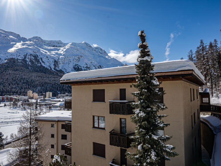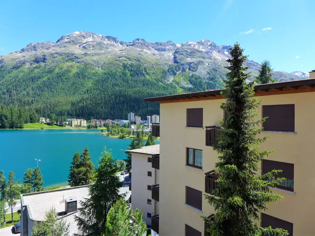 St. Moritz-Bad: Simple apartment house "Chesa Sonnalpine B", 8 storeys, built in 1968. In the resort 800 m from the centre of St.Moritz-Bad, 600 m from the centre of St.Moritz-Dorf, in a central, busy, sunny position, 50 m from the lake, 1 km from the skiing area. In the house: lift, central heating system. Public car park at 600 m, public parking 50 m. Shop 260 m, supermarket, restaurant 200 m, bakery 500 m, café 700 m, bicycle rental 800 m, bus stop "St. Moritz Bad, Via Aruons" 180 m, railway station 1.5 km, indoor swimming pool 1 km, thermal baths "Heilbadzentrum St. Moritz" 1.2 km, lake St. Moritzer See 50 m. Golf course (18 hole) 7.7 km, tennis 1.5 km, indoor tennis centre 1.5 km, minigolf 1 km, riding stable 2.8 km, walking paths from the house 100 m, cycle lane 1 km, cable car 1.4 km, ski lift 1 km, slopes 1.4 km, ski rental 1 km, ski bus stop 180 m, ski school 1 km, children's ski school 1 km, sled run 5.7 km, cross country ski track 1 km, ice rink 500 m, children's playground 1.3 km. Nearby attractions: Segantini Museum 1.2 km, Engadiner Museum 120 m, Mili Weber-Haus 2 km, Olympia Bob Run mit Museum 1.7 km, Nietzsche Museum in Sils-Maria 10 km. Well-known ski regions can easily be reached: Corviglia Piz Nair 1 km, Corvatsch - Furtschellas 7 km, Diavolezza - Lagalb 19 km. Well-known lakes can easily be reached: St. Moritzer See 50 m, Silvaplaner See 5.7 km, Silser See 10 km. Hiking paths: Stazerwald & Stazersee, Corviglia Piz Nair, Muottas Muragl. Please note: Loading and unloading of baggage is possible at the holiday house. The keys‘ handover takes place by the agency Interhome in St. Moritz Bad. Additional accommodations can be booked."Chesa Sonnalpine B 46", 5-room apartment 105 m2 on 4th floor. Partly renovated in 2018, practical furnishings: living/dining room with TV and radio. Exit to the balcony, south-east facing position. 1 double bedroom with 2 beds (90 cm, length 190 cm). 1 room with 2 beds (80 cm, length 190 cm). 1 children's room with 2 beds (90 cm, length 200 cm), 1 pull-out bed. Exit to the balcony. 1 room with 1 double bed (1 x 160 cm, length 190 cm). Small kitchen 8 m2 (oven, dishwasher, 4 induction hot plates, toaster, kettle, freezer, electric coffee machine, Capsules for coffee machine (Nespresso) extra, fondue Set (chinoise, cheese)). Bath/bidet/WC, sep. WC, bath/shower/WC. 2 balconies. Beautiful view of the lake and the mountains. Facilities: hair dryer. Internet (WiFi, free). Garage space n 46 (1 car), height 183 cm, width 240 cm. Please note: non-smokers only. Maximum 2 pets/ dogs allowed. The parking garage has a height and a limited depth.