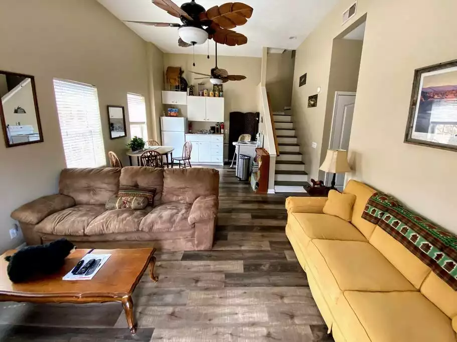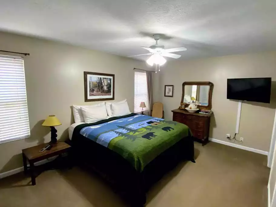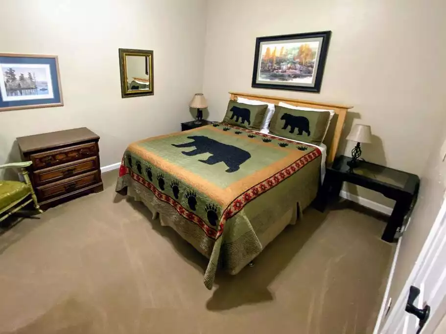 The upstairs living space consists of two suites, each on a different floor with their own private bathrooms, a great room, a dining room, a full kitchen, a half bath, and a covered porch overlooking the river. The master bedroom on the main floor has a king size bed and a full private bathroom. The honeymoon suite upstairs has an Amish king-size bed, a daybed with a trundle, a sitting area, a vaulted wood ceiling, and a full private bathroom. Guests with bad knees or other disabilities can easily access the bedroom on the main floor (only two steps on the front porch). We also have a handicap shower/bathtub bench for the main floor master bathroom. The house is not handicap accessible although one previous guest with a wheelchair commented that she was able to get around the main floor just fine.