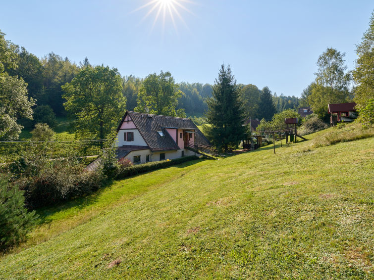 Chlívce 8 km from Hronov: Cosy country house "Chlívce u Hronova", 2 storeys, detached. Outside the resort, in a quiet, elevated position. For shared use: property 1'000 m2, swimming pool round (4,60 m diameter, seasonal availability: 01.Jul. - 31.Aug.). Arbour, garden furniture, barbecue, fireplace, barbecue house, children's playground, parking at the house. Shop 3.5 km, shopping centre 8 km, restaurant 250 m, bus stop "Chlívce" 500 m, railway station "Hronov, Červený Kostelec" 8 km, outdoor swimming pool 9 km, indoor swimming pool 35 km, natural swimming pond 4 km. Ski lift, slopes 200 m, cross country ski track 10 m. Nearby attractions: Muzeum Aloise Jiráska/Hronov 8 km, Adršpašsko-teplické skály 17 km, Broumovské stěny, Náchod 17 km, Ratibořice a Babiččino údolí 20 km, Broumov 28 km, Relaxpark Pec pod Sněžkou 50 km. Well-known ski regions can easily be reached: Radvanice 10 km, Petřikovice 16 km, Mladé Buky 34 km, Janské Lázně 40 km. Well-known lakes can easily be reached: vodní nádrž Rozkoš 25 m. Children's house in the garden. It is possible to arrange meals in a private club, which is at a distance of 250 m (on request). This cottage can be rented as a whole house or separately as 4 fully equipped apartments in the low season.1-room studio 36 m2, on the upper floor. Living/sleeping room with sloping ceilings with 1 double sofabed, 1 double bed and satellite TV. Kitchenette (2 hot plates, kettle, microwave, grill, electric coffee machine) with dining table. Shower/WC. Electric heating, boiler. Facilities: Internet (WiFi, free). Please note: suitable for families. Non-smokers only. 1 small pet/ dog allowed.