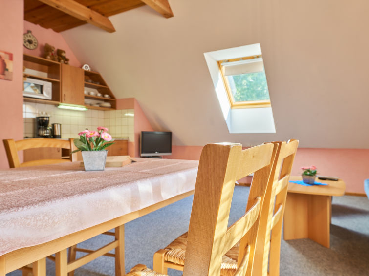 Chlívce 8 km from Hronov: Cosy country house "Chlívce u Hronova", 2 storeys, detached. Outside the resort, in a quiet, elevated position. For shared use: property 1'000 m2, swimming pool round (4,60 m diameter, seasonal availability: 01.Jul. - 31.Aug.). Arbour, garden furniture, barbecue, fireplace, barbecue house, children's playground, parking at the house. Shop 3.5 km, shopping centre 8 km, restaurant 250 m, bus stop "Chlívce" 500 m, railway station "Hronov, Červený Kostelec" 8 km, outdoor swimming pool 9 km, indoor swimming pool 35 km, natural swimming pond 4 km. Ski lift, slopes 200 m, cross country ski track 10 m. Nearby attractions: Muzeum Aloise Jiráska/Hronov 8 km, Adršpašsko-teplické skály 17 km, Broumovské stěny, Náchod 17 km, Ratibořice a Babiččino údolí 20 km, Broumov 28 km, Relaxpark Pec pod Sněžkou 50 km. Well-known ski regions can easily be reached: Radvanice 10 km, Petřikovice 16 km, Mladé Buky 34 km, Janské Lázně 40 km. Well-known lakes can easily be reached: vodní nádrž Rozkoš 25 m. Children's house in the garden. It is possible to arrange meals in a private club, which is at a distance of 250 m (on request). This cottage can be rented as a whole house or separately as 4 fully equipped apartments in the low season.1-room studio 36 m2, on the upper floor. Living/sleeping room with sloping ceilings with 1 double sofabed, 1 double bed and satellite TV. Kitchenette (2 hot plates, kettle, microwave, grill, electric coffee machine) with dining table. Shower/WC. Electric heating, boiler. Facilities: Internet (WiFi, free). Please note: suitable for families. Non-smokers only. 1 small pet/ dog allowed.