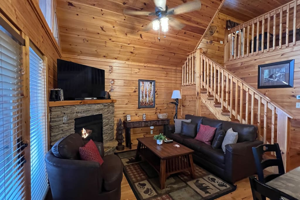 Escape to serenity at "A BLACK BEARS TRAIL," an enchanting log cabin nestled within Gatlinburg's prestigious Black Bear Falls Resort. This charming retreat offers a tranquil haven, boasting a spacious 1-bedroom (King) layout complemented by a cozy loft room (Queen). Step into a world of rustic elegance, where cathedral ceilings and large windows frame breathtaking mountain vistas, inviting you to unwind in the embrace of nature's splendor.