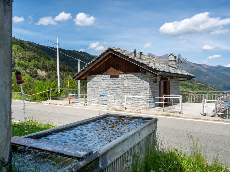 Rustic single-family house "Conclonaz", 1'200 m a.s.l., 2 storeys. In the hamlet Conclonaz 9 km from the centre of Sarre, 12 km from the centre of Aosta, in a quiet, sunny, elevated position on a slope, along the wooded area, located by a road. Private: garden 50 m2 (fenced) with lawn and trees, lawn for sunbathing. Garden furniture, barbecue house. In the house: storage room for bicycles. Motor access to the house. Parking on the premises. Bus stop "Sarre" 9 km. Nearby attractions: ovovia Aosta-Pila 13 km, Courmayeur Mont Blanc 38 km. Please note: car recommended.2-room apartment 65 m2 on 2 levels. Bright, simple and comfortable furnishings: living room with 1 double sofabed and satellite TV (flat screen). Walk-through room. Exit to the balcony. Kitchen (oven, 3 gas rings) with dining table. Exit to the garden. Shower/bidet/WC. No heating option. Upper floor: (steep stair), 1 double bedroom with bath/bidet/WC. Exit to the terrace. Large terrace. Terrace furniture. Beautiful panoramic view of the mountains and the valley. Parking (fenced). Suitable for families. IT007066C2JCU5RBLK