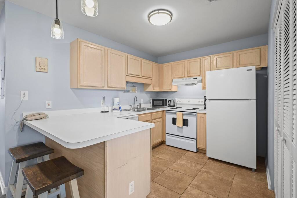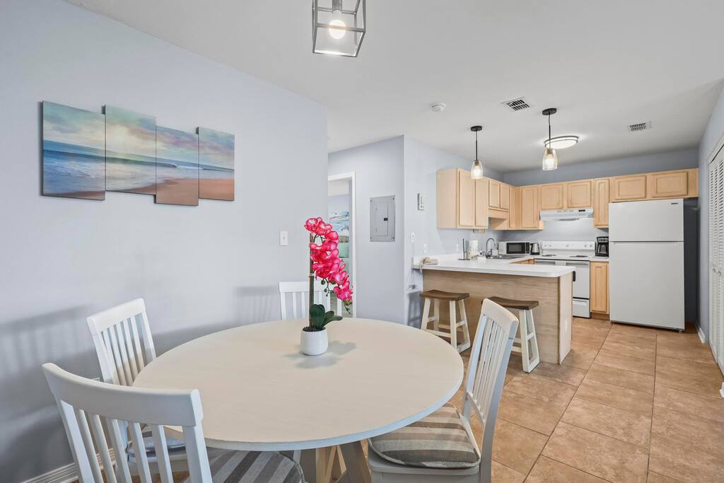 This beachy condo has an open floor plan that allows your family and friends to enjoy hanging out together while you're watching TV, cooking your favorite meal, or sitting and laughing around the dining table that comfortably sits 4.
