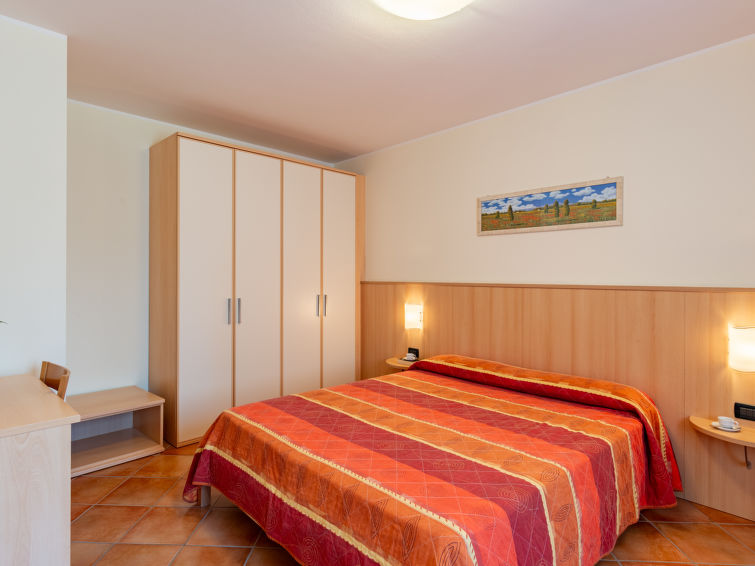 Residence "Corte Camaldoli". 20 apartments in the residence. On the outskirts, 1.2 km from the centre of Garda, on a slope, 1.5 km from the lake. For shared use: property 14'000 m2, well-kept terraced garden with lawn and trees, swimming pool (20 x 10 m, seasonal availability: 01.Apr. - 30.Oct.). WC in the pool area, outdoor shower, beach volleyball, patio, arbour, garden furniture, barbecue, children's playground. In the complex: reception, lounge with TV, internet access, WiFi, fitness room, table tennis, table football, storage room for bicycles, washing machine (for shared use), heating to be paid on the spot, bicycle rental. Bread roll service. Parking on the premises. Bus stop 20 m, pebble beach 1.5 km. Golf course (18 hole) 5 km. Nearby attractions: Peschiera del Garda 29 km, Malcesine 30 km, Verona 38 km. Hiking paths: Monte Baldo 30 km. The owner does not accept any youth groups. Residence with electric gates. Air conditioning only available from early June to mid September."Rustico", 3-room apartment 60 m2. Comfortable and beautiful furnishings: living/sleeping room with 1 sofabed, 1 pull-out bed, dining table, satellite TV, DVD and air conditioning. 1 double bedroom with air conditioning. 1 room with 2 beds and air conditioning. Open kitchen (dishwasher, 4 gas rings, toaster, kettle, microwave, freezer, electric coffee machine). Shower/bidet/WC. Gas heating (extra). Small balcony or patio. Balcony furniture. View of the countryside. Facilities: telephone, safe, hair dryer. Internet (WiFi, free). Parking (1 car). IT023036B4MWIM4KFA